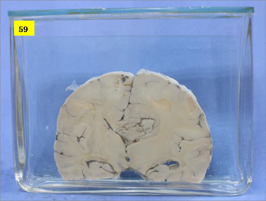 右侧大脑半球侧脑室消失,代之以颗粒状肿瘤,并局部浸润邻近脑组织。