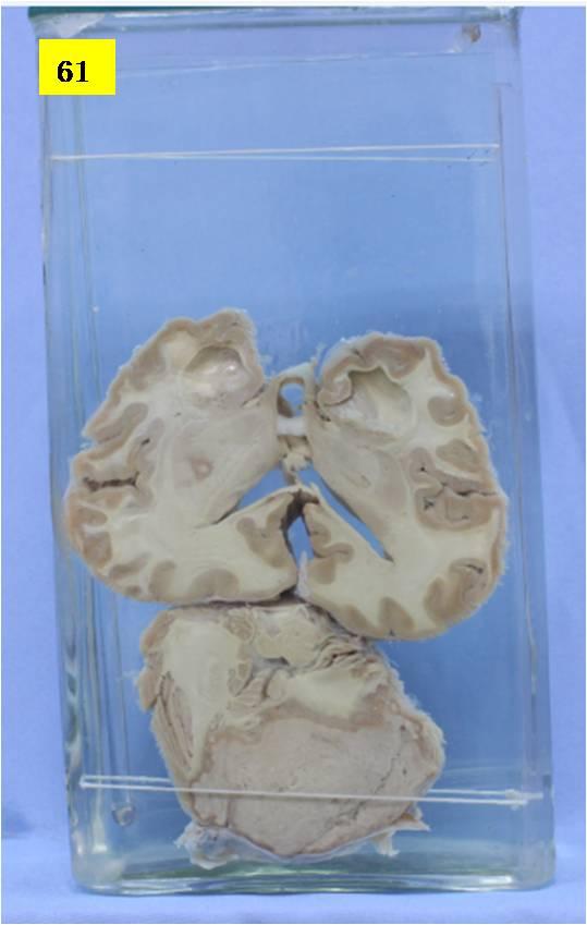 小脑水平切片,见小脑中央被灰白色的肿瘤组织所占据。肿瘤质地较松,有浅表性脱落,肿瘤和正常组织分界不清,其大致量度为4×5cm,并可见灶性出血灶(黑色),并局部转移到基底节,侧脑室、中脑导水管扩张(脑积水),经镜下证实为室管膜瘤(源于第四脑室)。