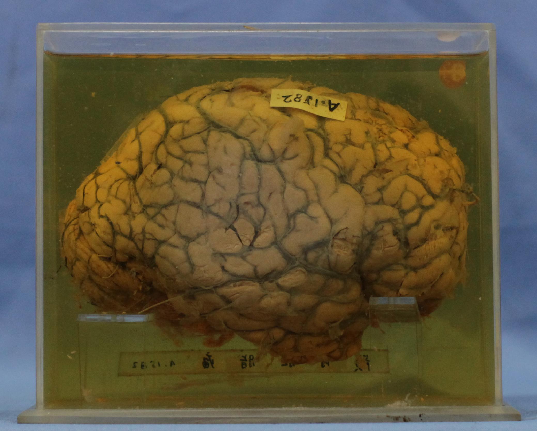 大脑矢状切面,见脑干后上部有一2×2cm三角形,白色占位,推挤,压迫周围组织,切片证实为胆(固醇)脂瘤。