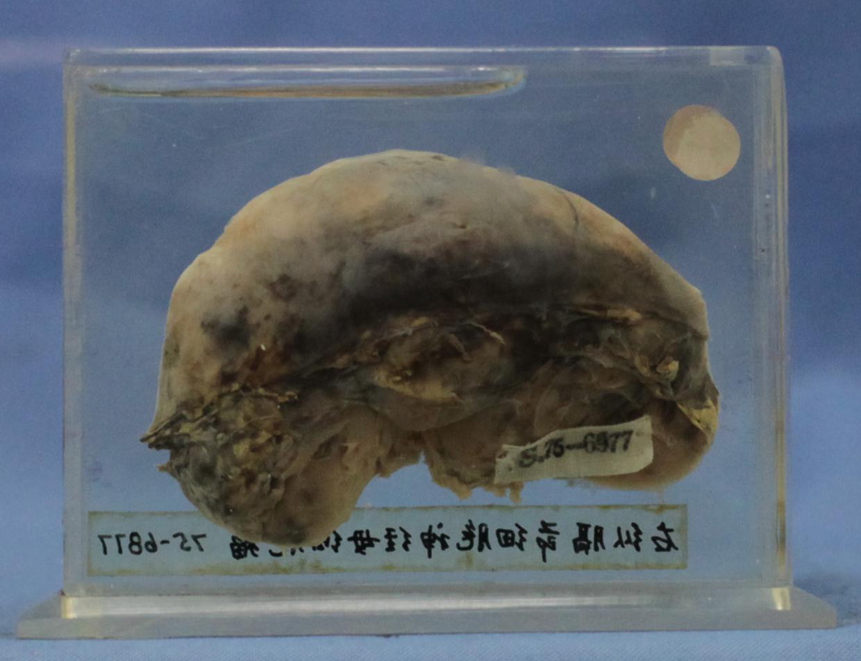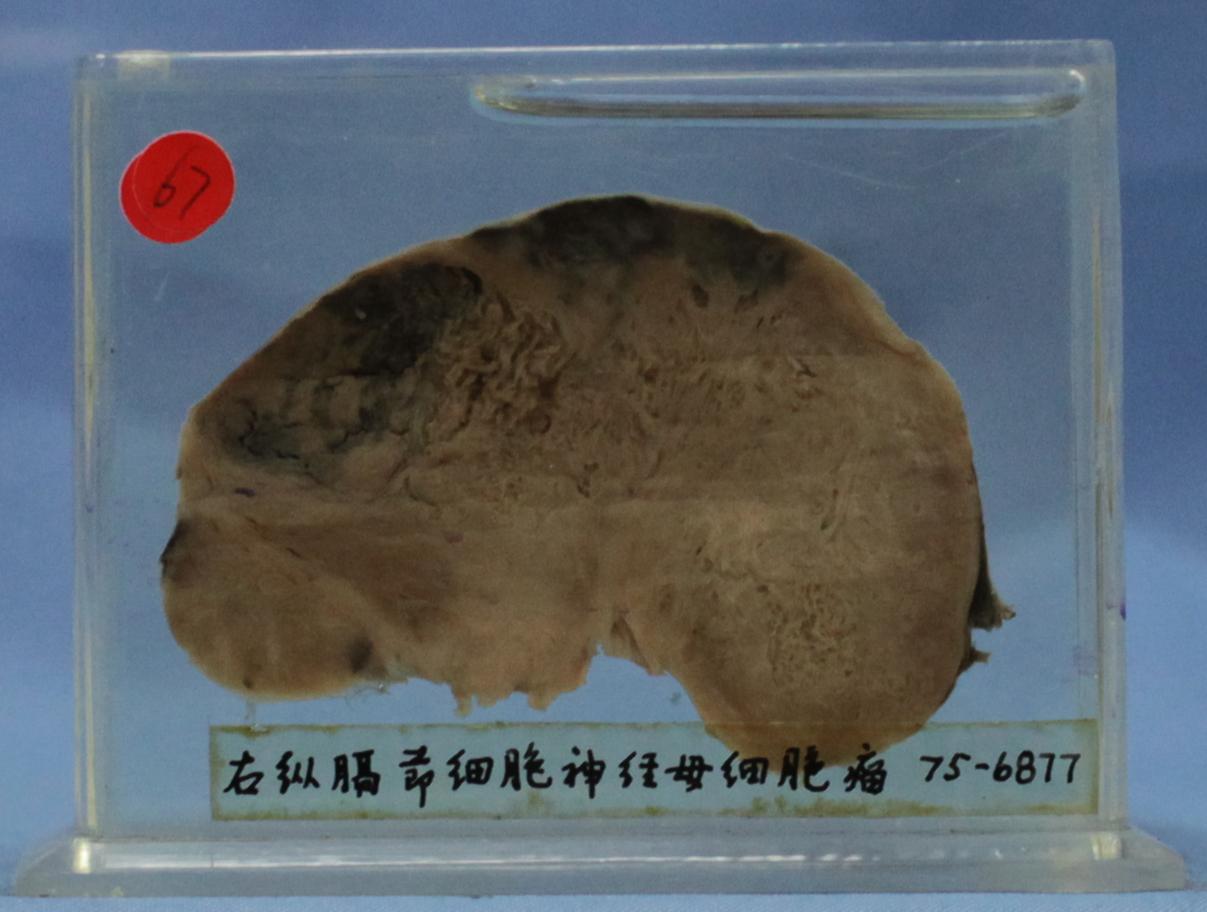 4×5.5cm白色肿物剖面,瘤体质地细腻呈乳白色,镜检证实其为(纵膈)节神经细胞瘤。