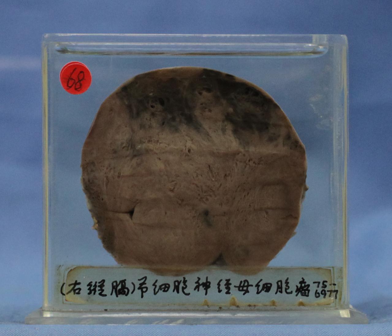 4×5.5cm白色肿物剖面,瘤体质地细腻呈乳白色,镜检证实其为(纵膈)节神经细胞瘤。