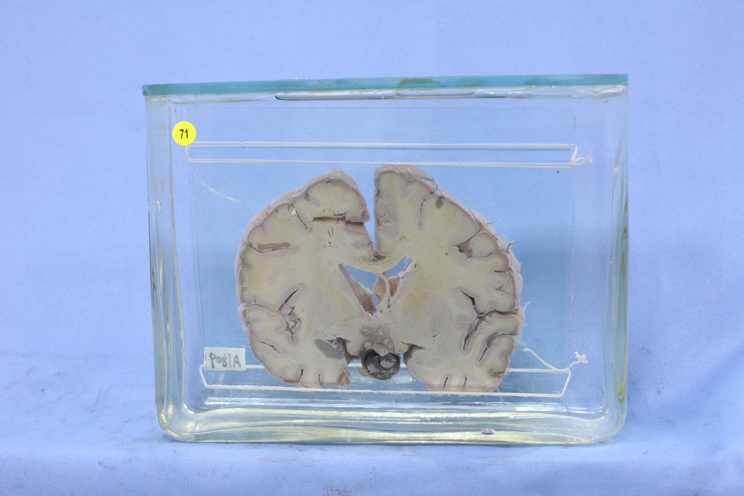 大脑经基底节冠切,垂体部位见直径1cm的黑色出血灶,其中可见灰红色细胞成分,并向上浸润前联合以下部位,其中可见灶状坏死。