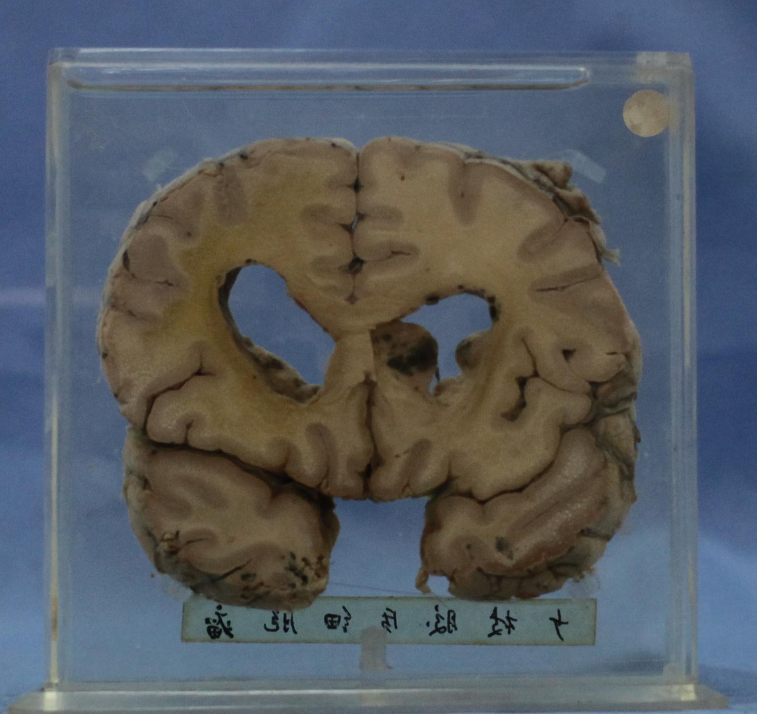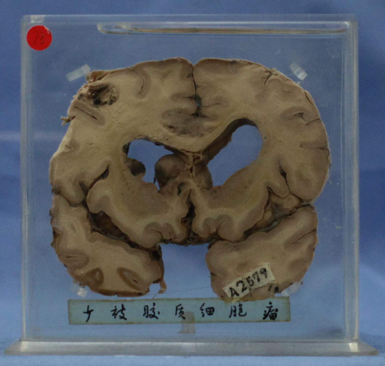 大脑冠切,左大脑半球上份颞叶顶部可见直径1cm组织松散并伴出血的肿瘤组织,周边较清。左侧基底节也可见直径0.5cm类似病变。双侧侧脑室扩大,经镜下证实为少突胶质细胞瘤。