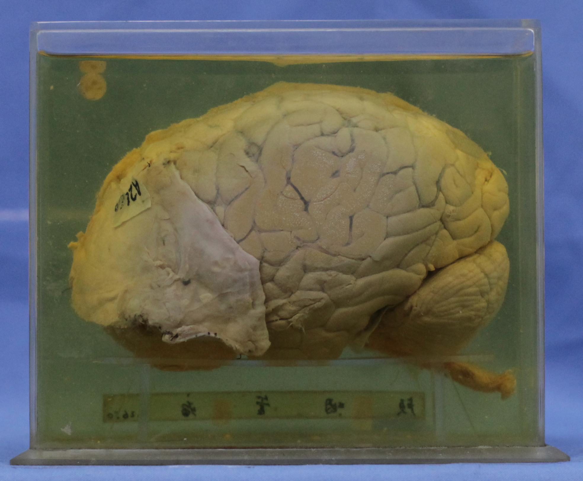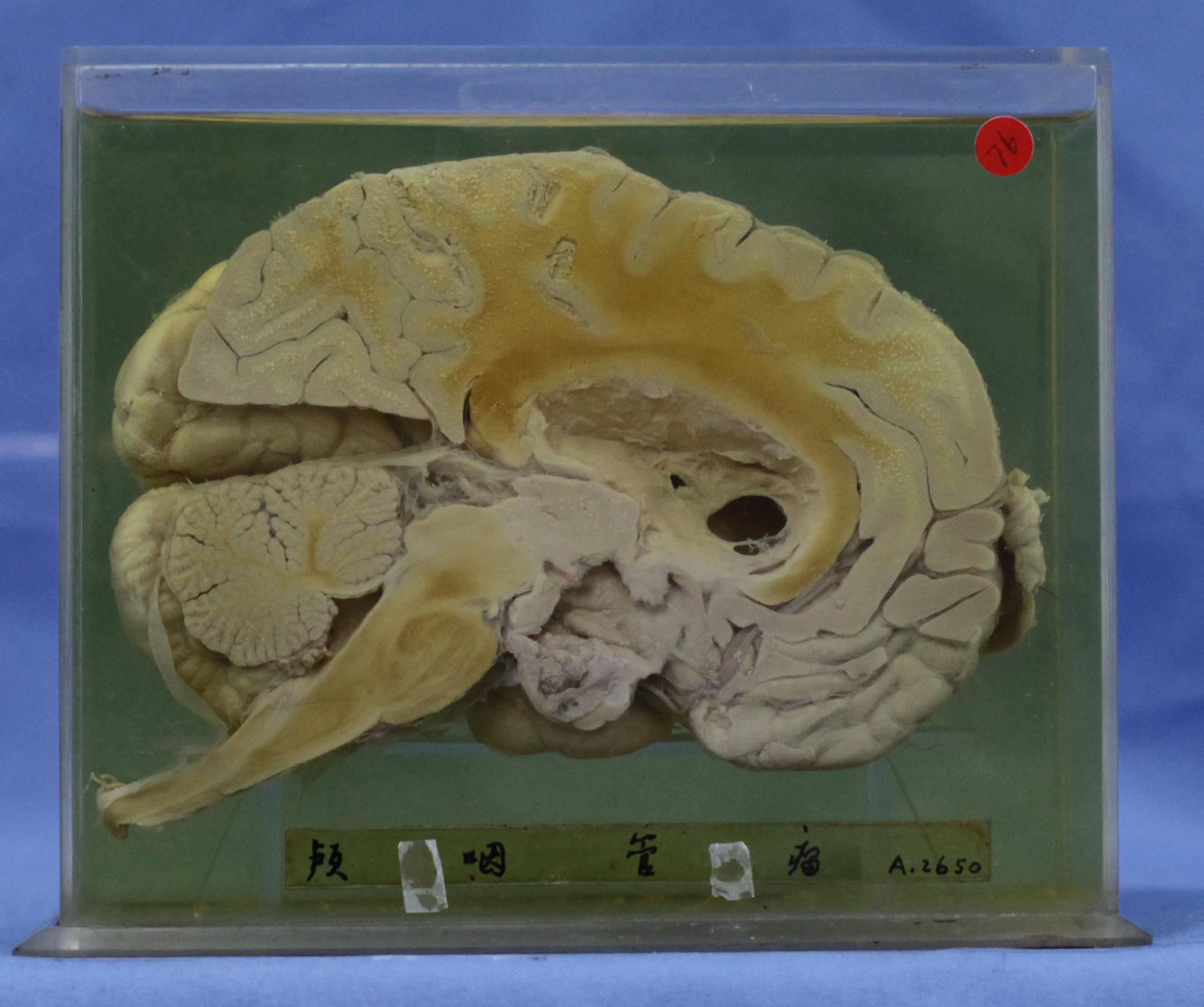 大脑矢状切面,在鞍区附近可见2×2cm囊性肿块,其囊壁尚附有少量灰黄色坏死物质,镜检证实其为颅咽管瘤。 神