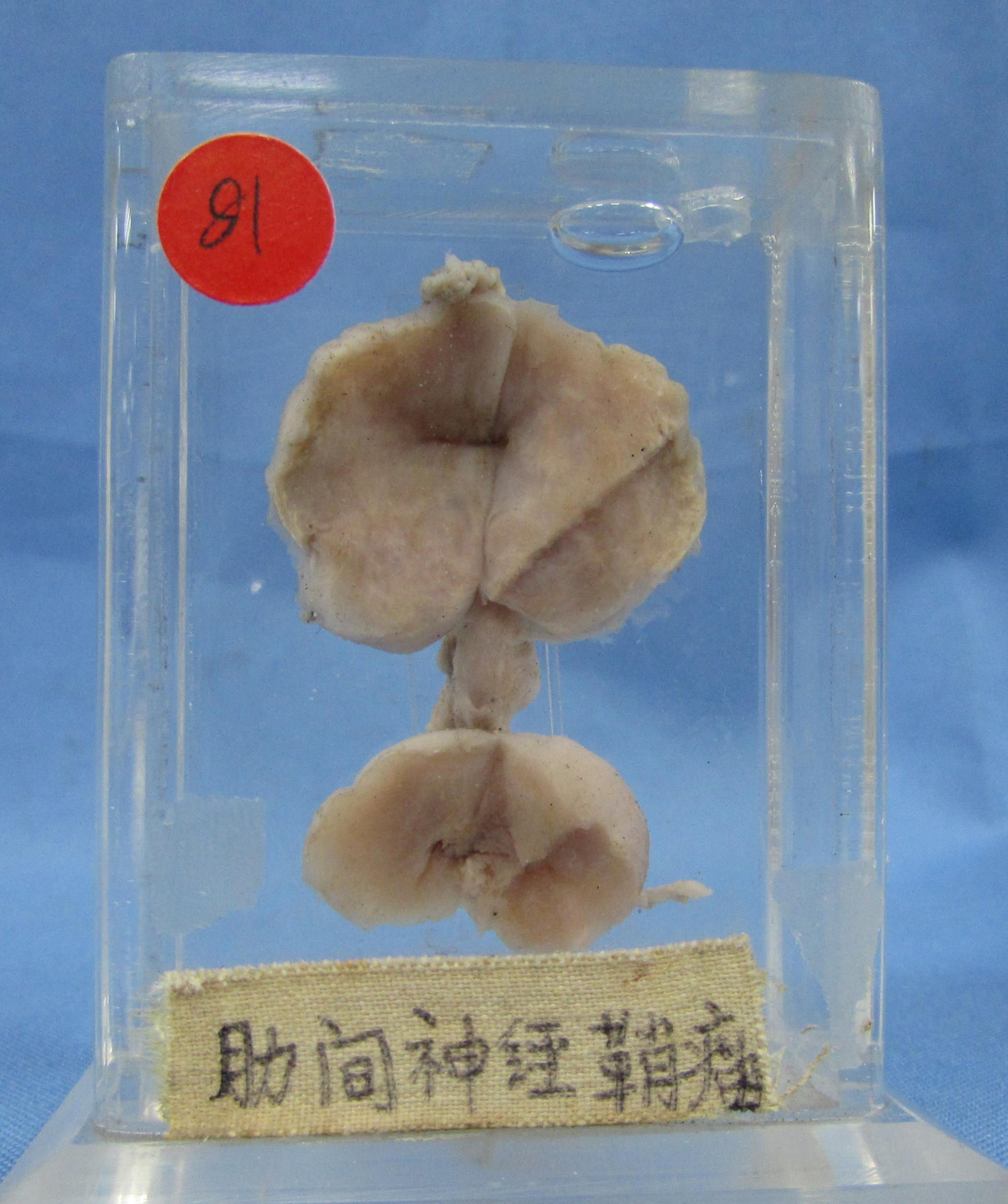 肋间神经手术切除标本,1×1×1.5cm和1×1.5×2cm手术切除标本两枚,包膜完整,剖面质地细腻,呈淡黄色,镜检证实为神经鞘瘤。