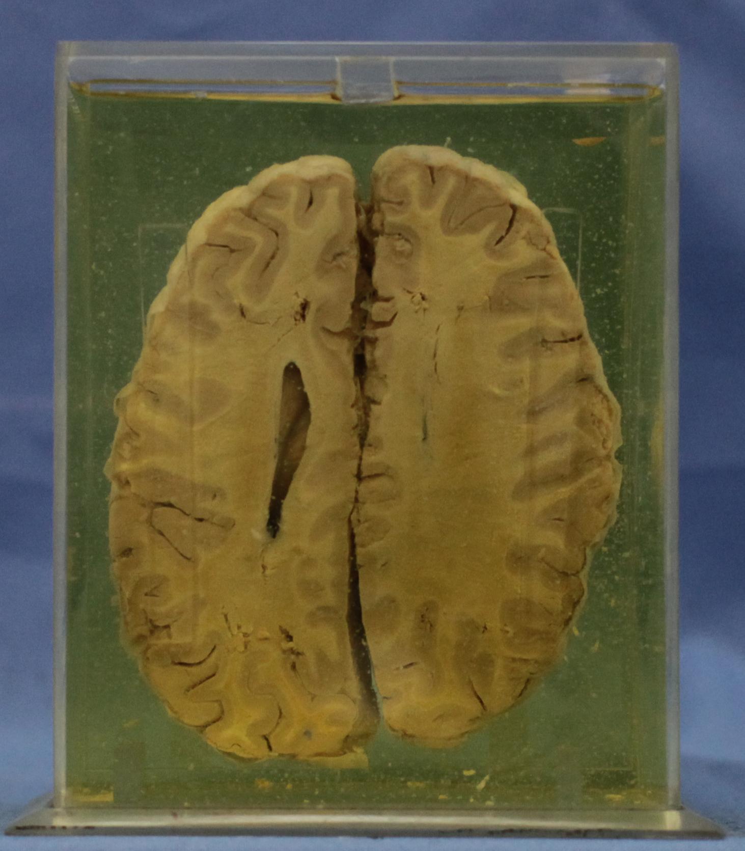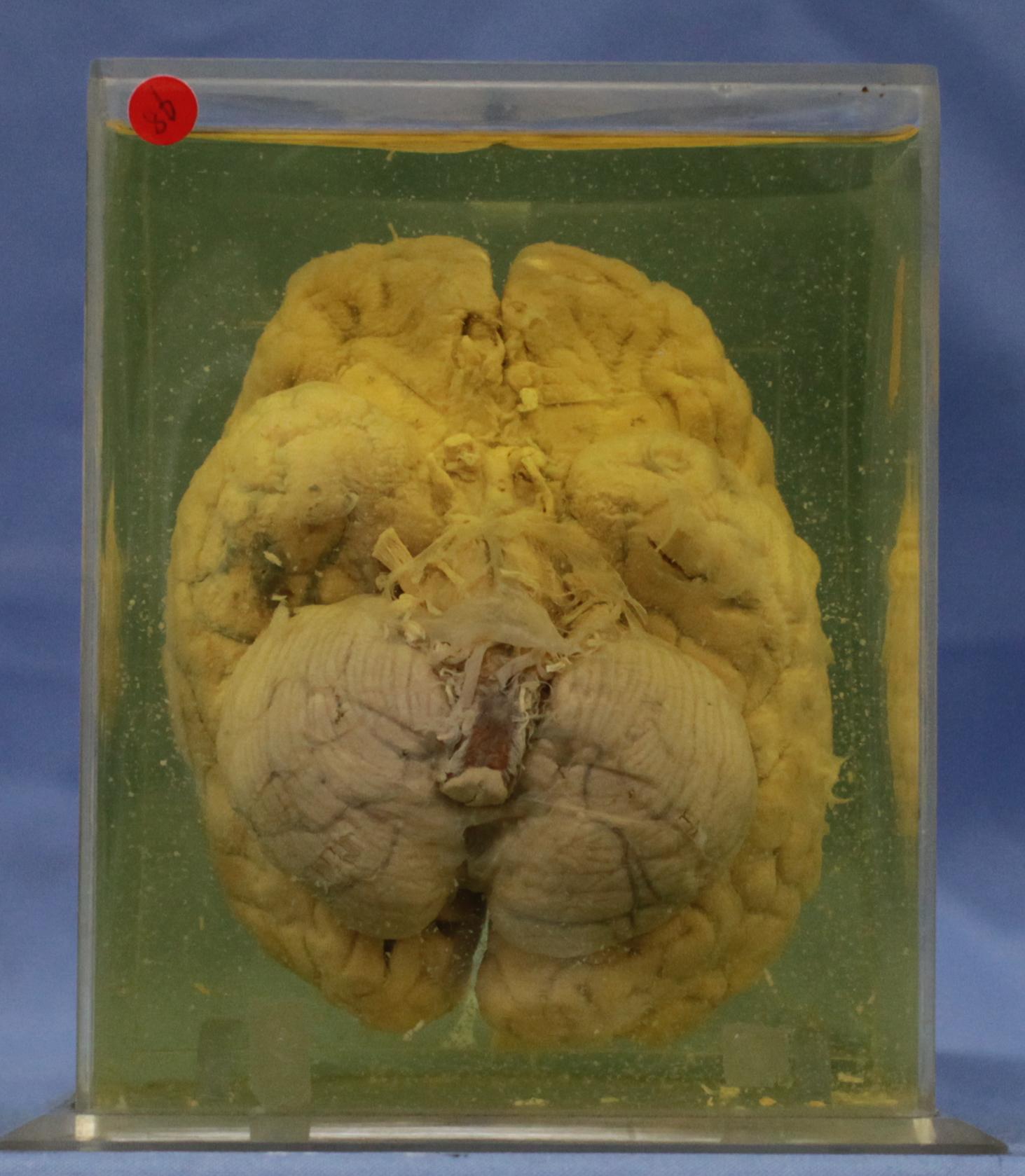 小儿脑水平切面,在其颅底面可见薄膜状的渗出物凝结物,尤以桥脑-视交叉和桥脑延脑交界处最明显。镜检证实其为结核性脑膜炎,由于这些渗出物富含蛋白,常可引起粘连和脑积水。