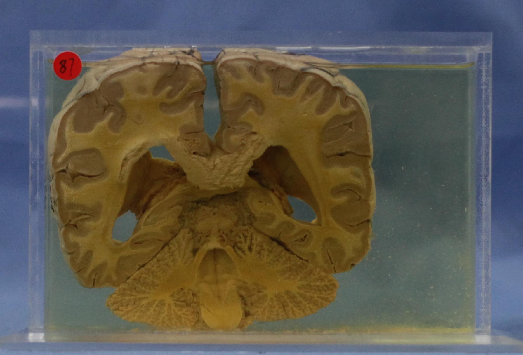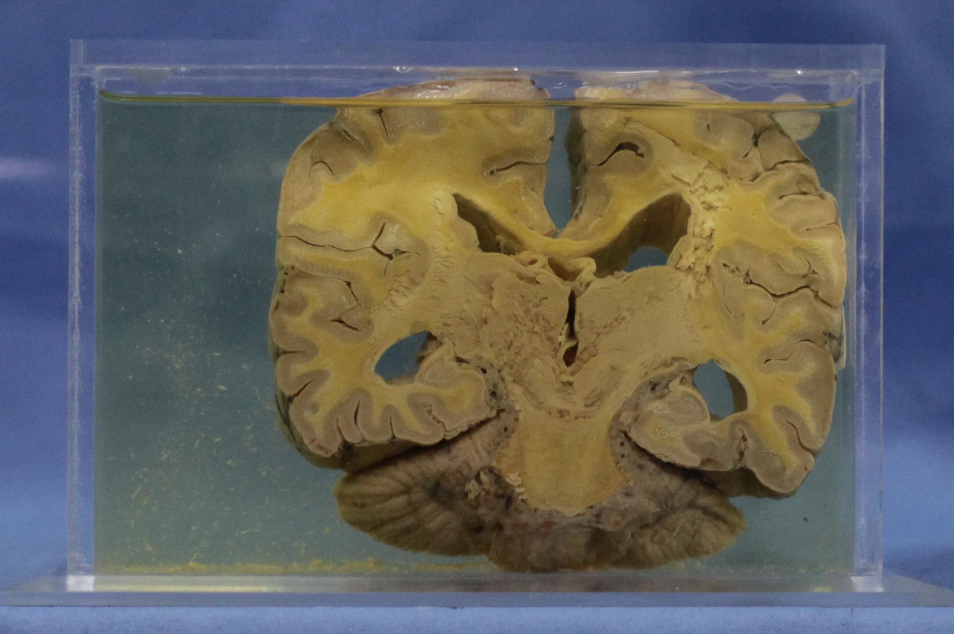 大小脑经海马和侧脑室下角冠状切面,两侧脑室及侧脑室下角以及部分第四脑室扩张积水。本例复习病史为结核性脑膜炎,由于此种脑膜炎渗出物中富含蛋白,易引起粘连和脑积水。