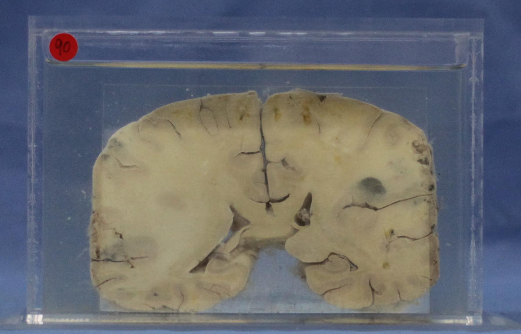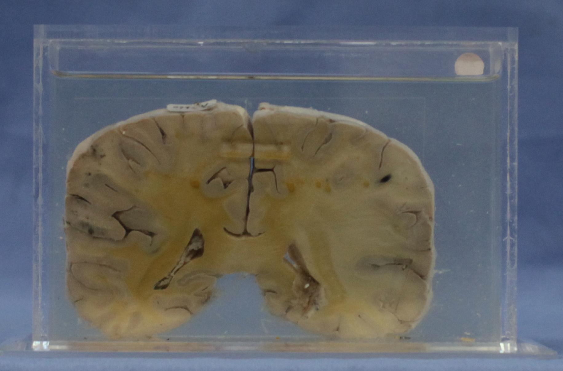 脑经侧脑室后角的脑冠状切面,在大脑脑膜下和脑实质内有大小不等黑色出血病灶,经镜检为脑梅毒。