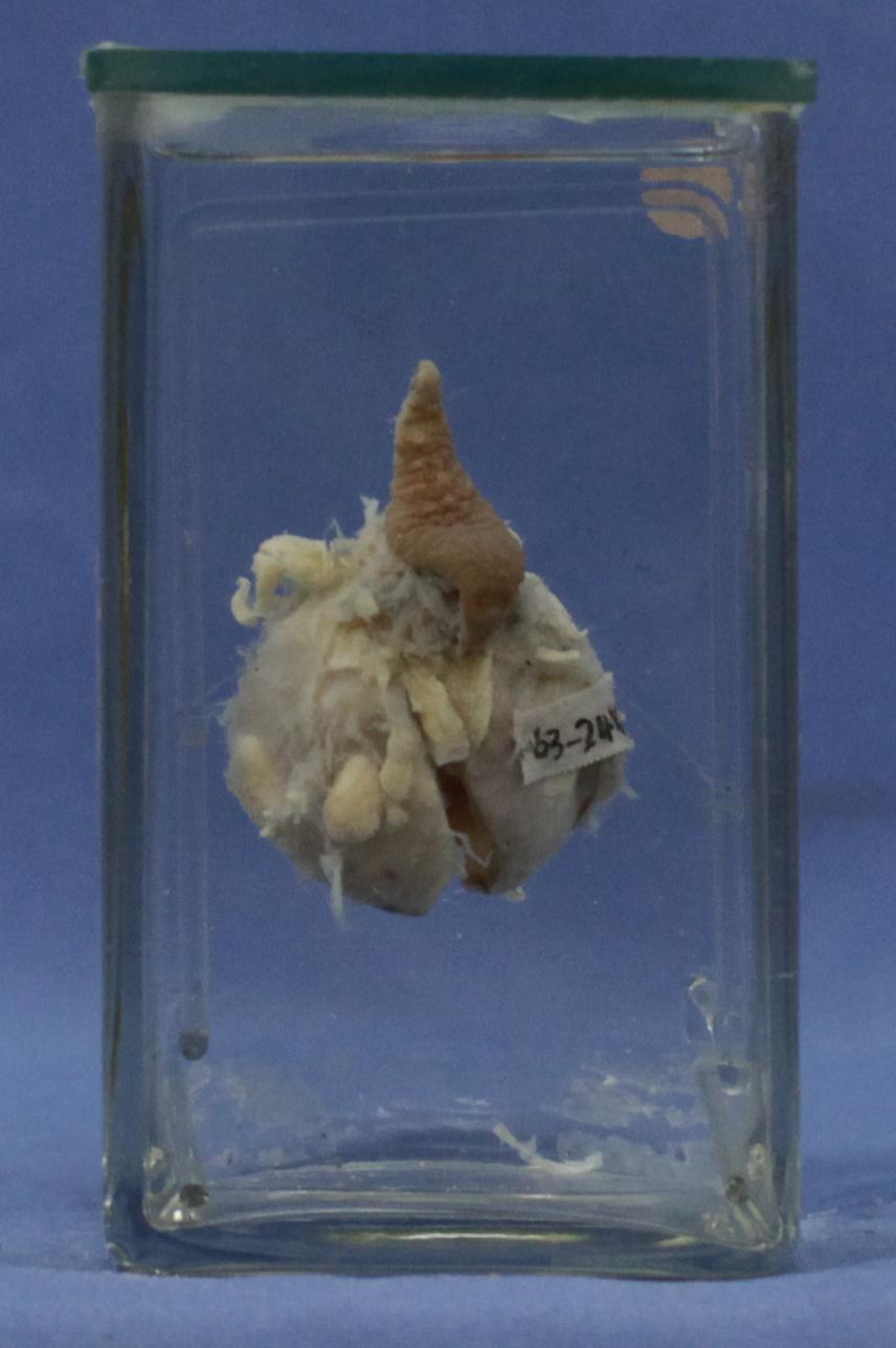皮下见一囊性肿块,直径约5厘米,囊壁薄,内壁光滑,内容物流失。镜下为良性囊肿,被覆鳞状上皮。