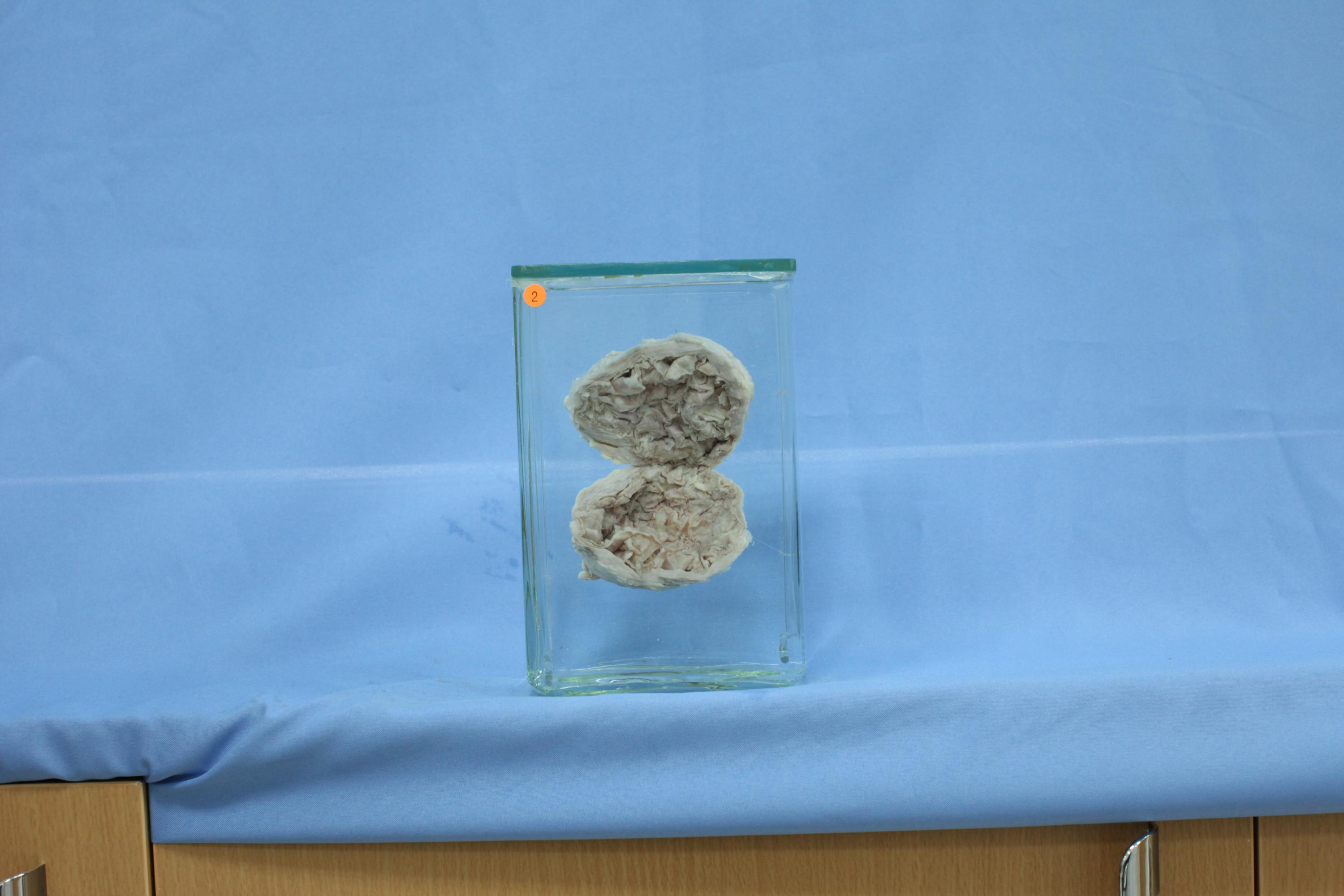 巨大囊肿一个,直径约9厘米,壁厚,内含少量角化物。镜下为良性囊肿,被覆鳞状上皮,伴周围慢性炎症反应。