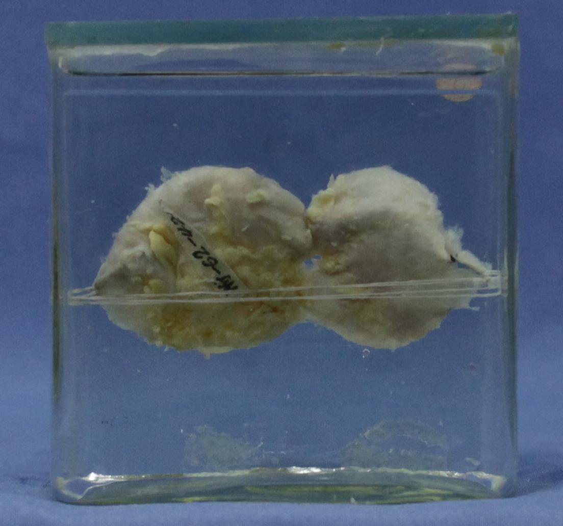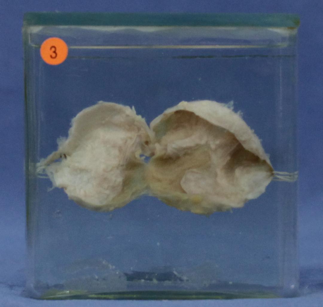 囊性肿块一个,直径约5厘米,囊壁薄,内壁光滑,内容物流失。镜下为良性囊肿,被覆鳞状上皮。
