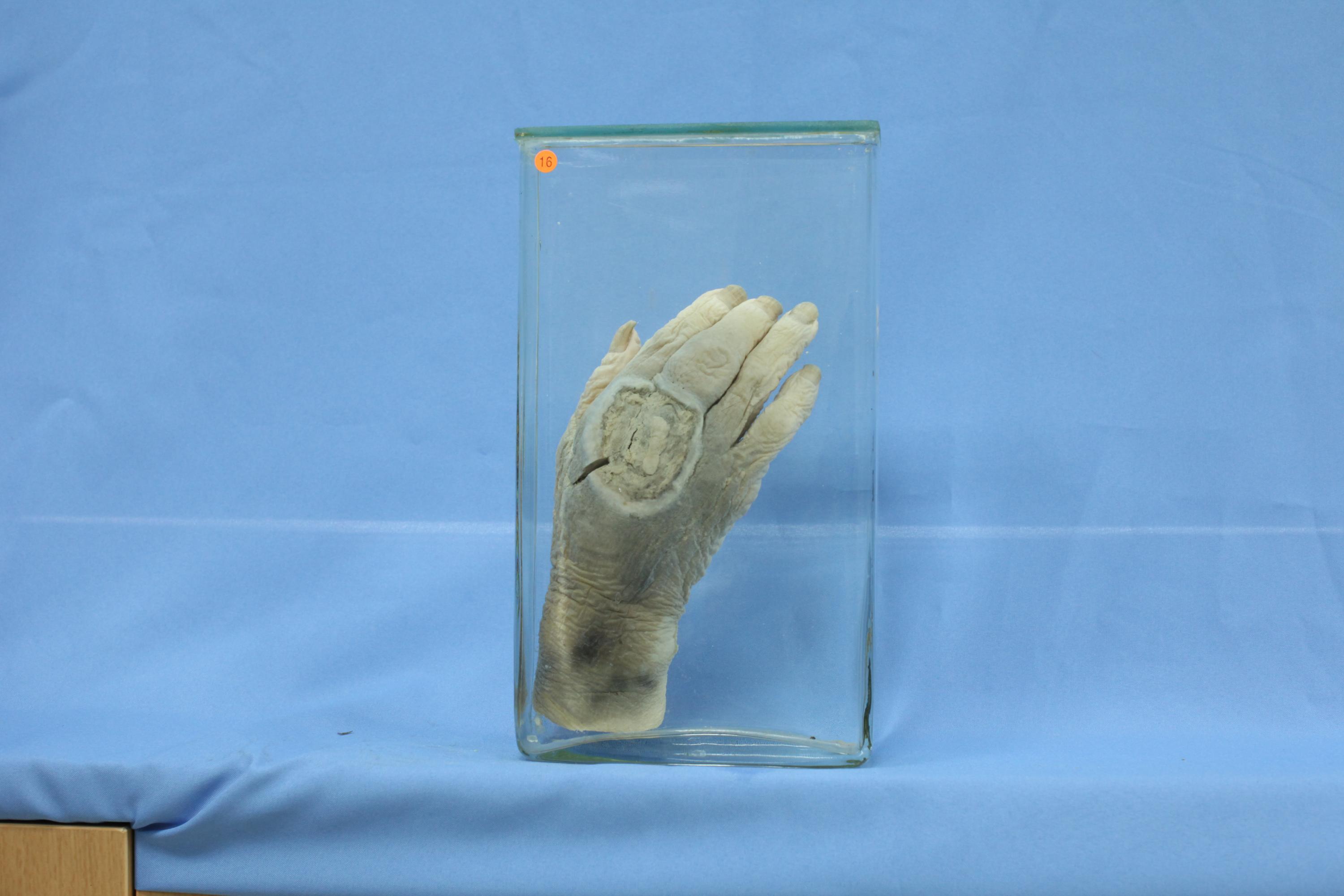 右手背见一溃疡型肿块,直径约7厘米,色灰白;镜下为起源于鳞状上皮的恶性肿瘤。