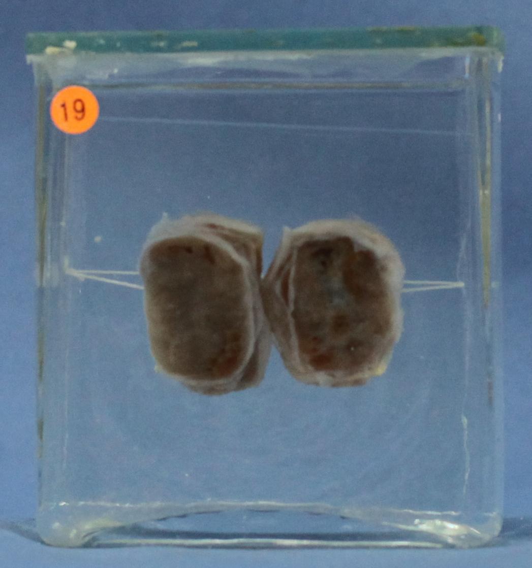 皮下见一圆形肿块,直径约4厘米,包膜完整;切面灰白灰黄,部分区域粘液样,质嫩;镜下类似发生于唾液腺组织的多形性腺瘤。
