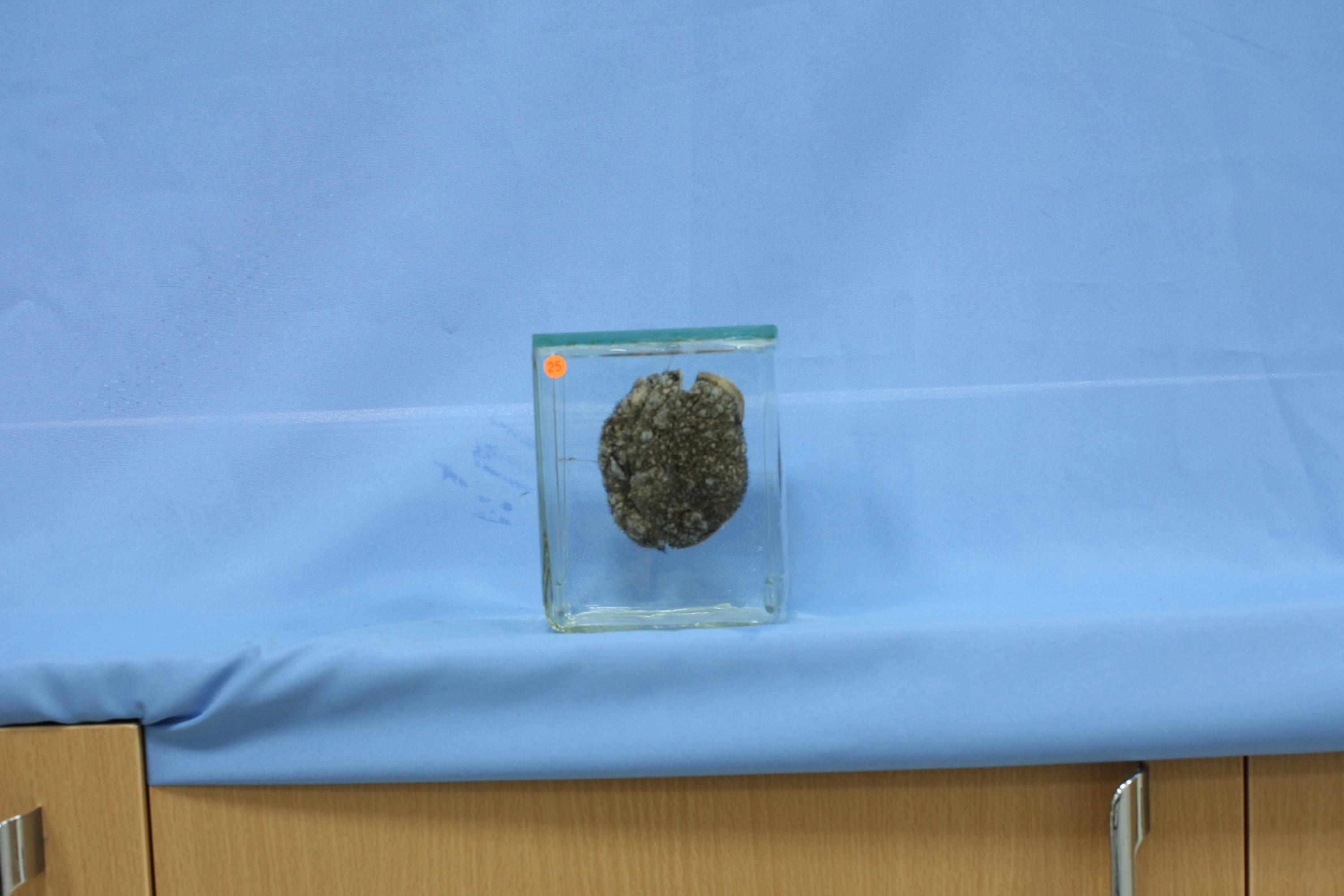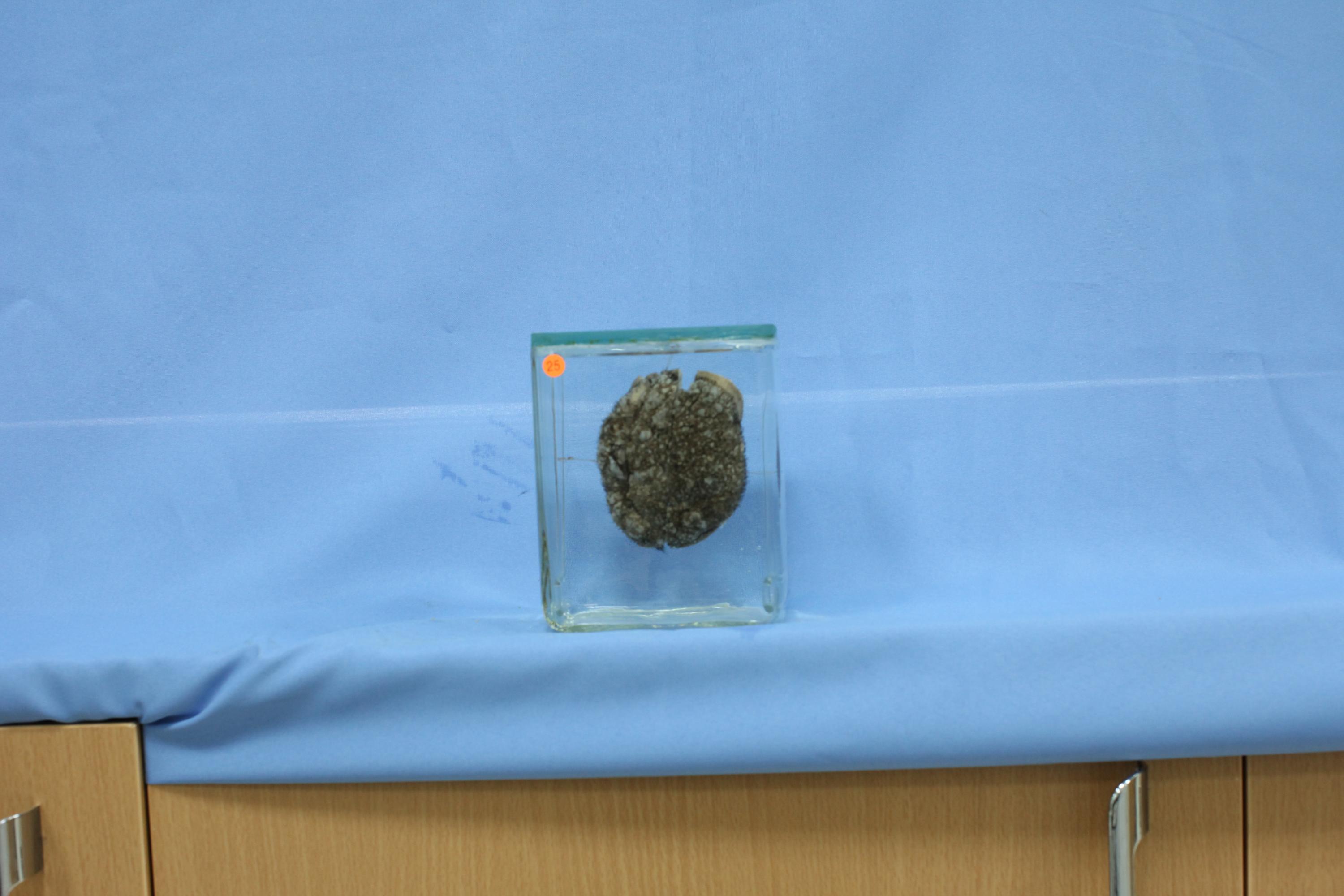 头皮表面见一巨大黑褐色隆起性病变,直径约10厘米,表面粗糙结节状,有毛发;镜下为黑素细胞增生引起的良性病变。