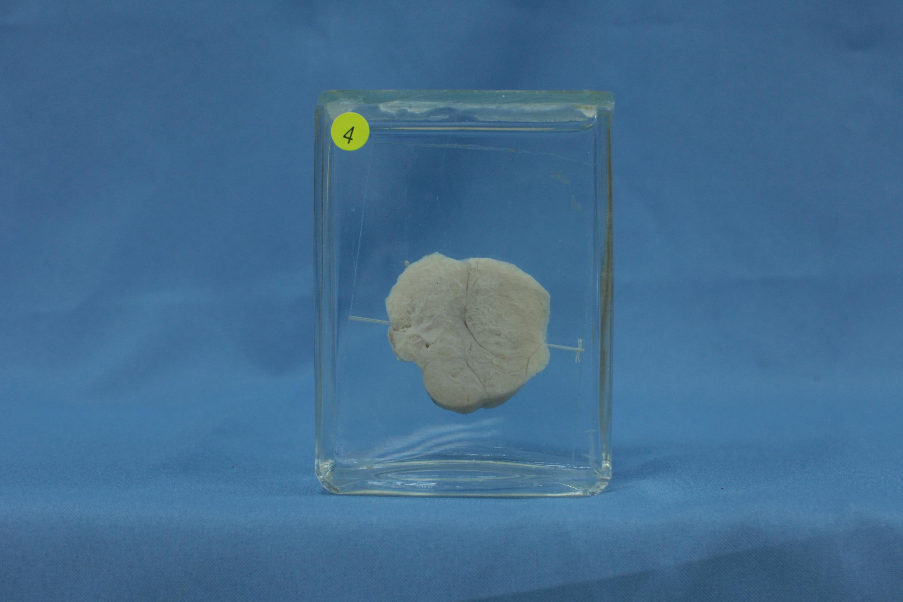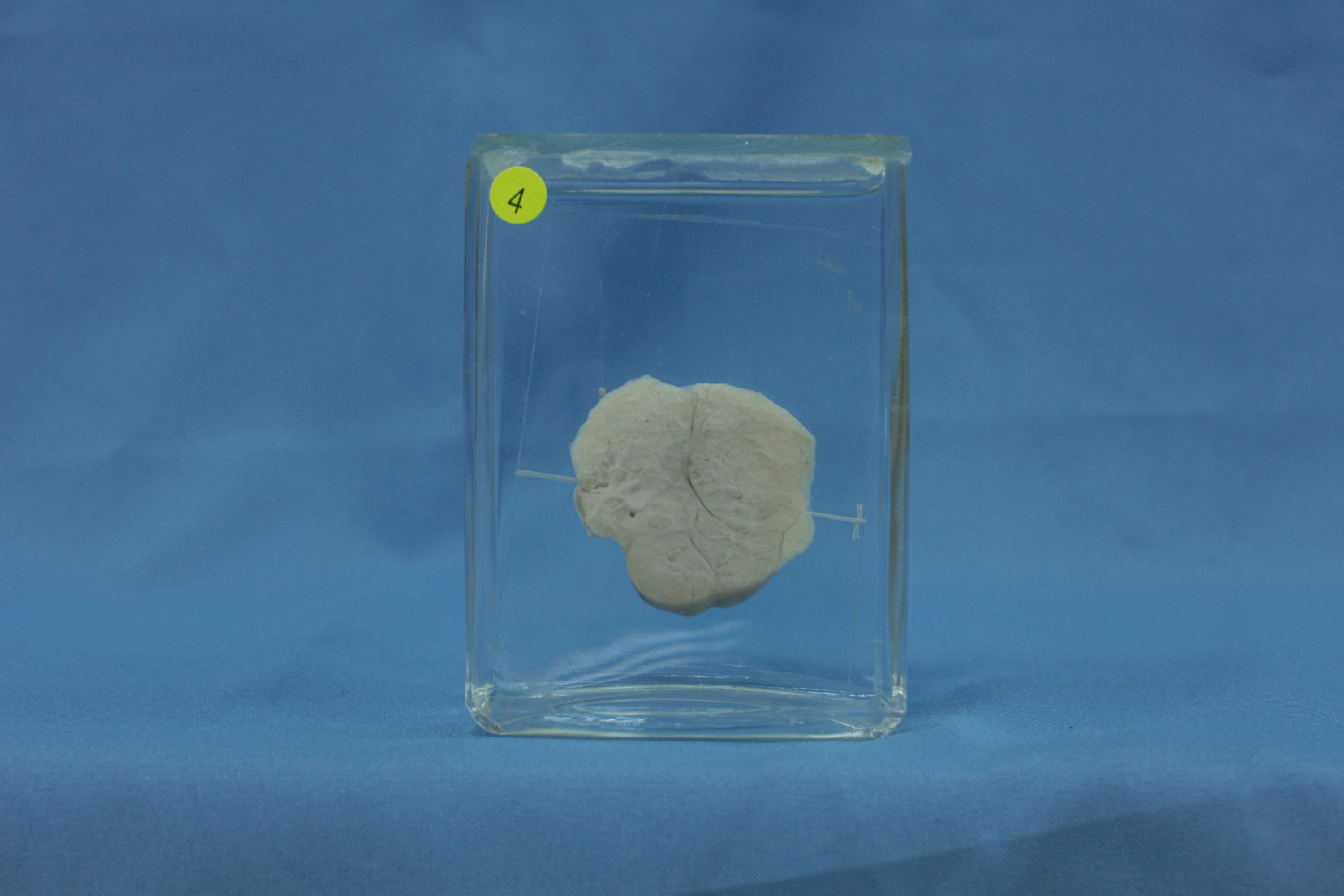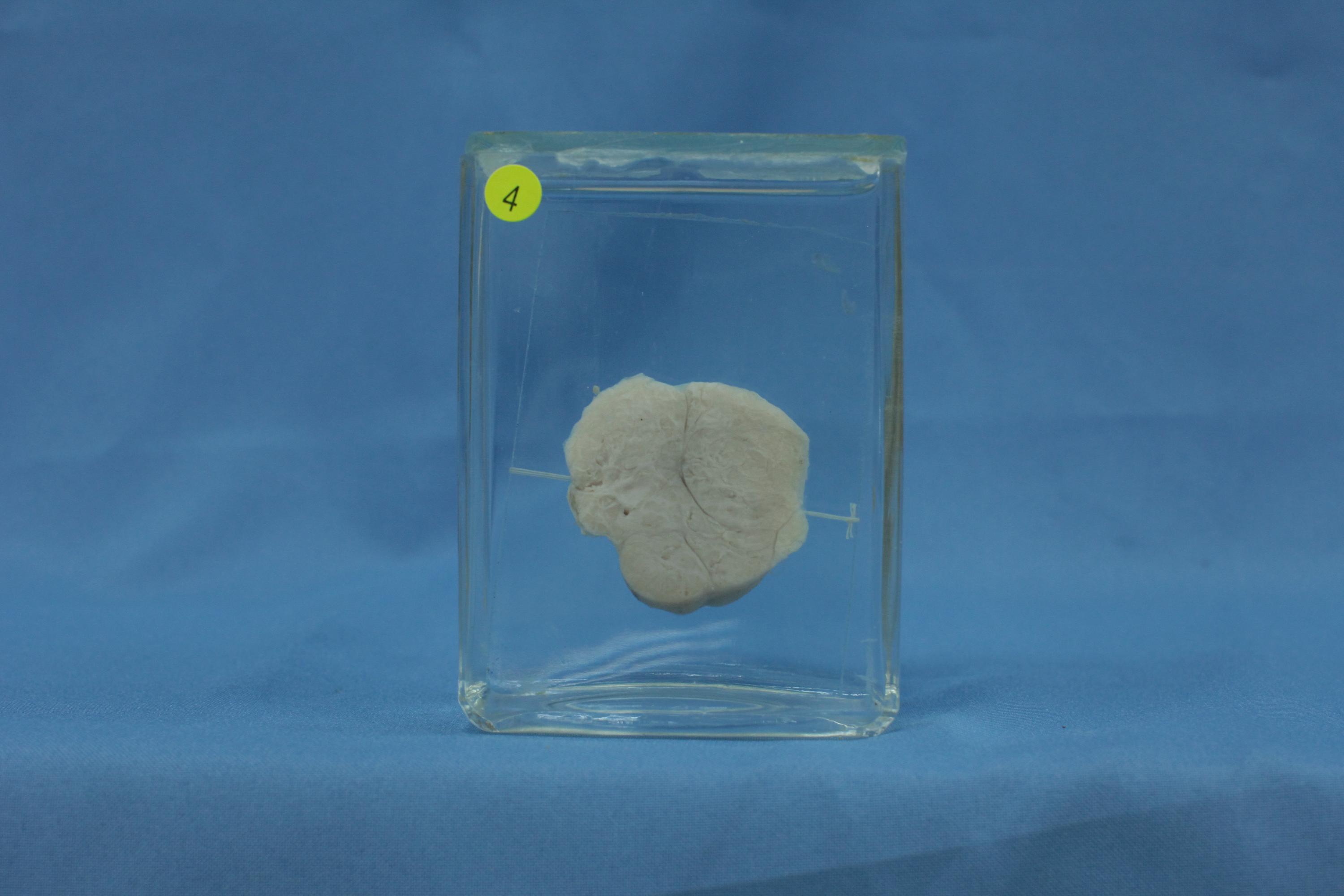 灰白色圆形肿块一个,直径约5厘米,有完整包膜;切面结节状,质韧;镜下为由乳腺导管及间质纤维组织增生形成的良性肿瘤。