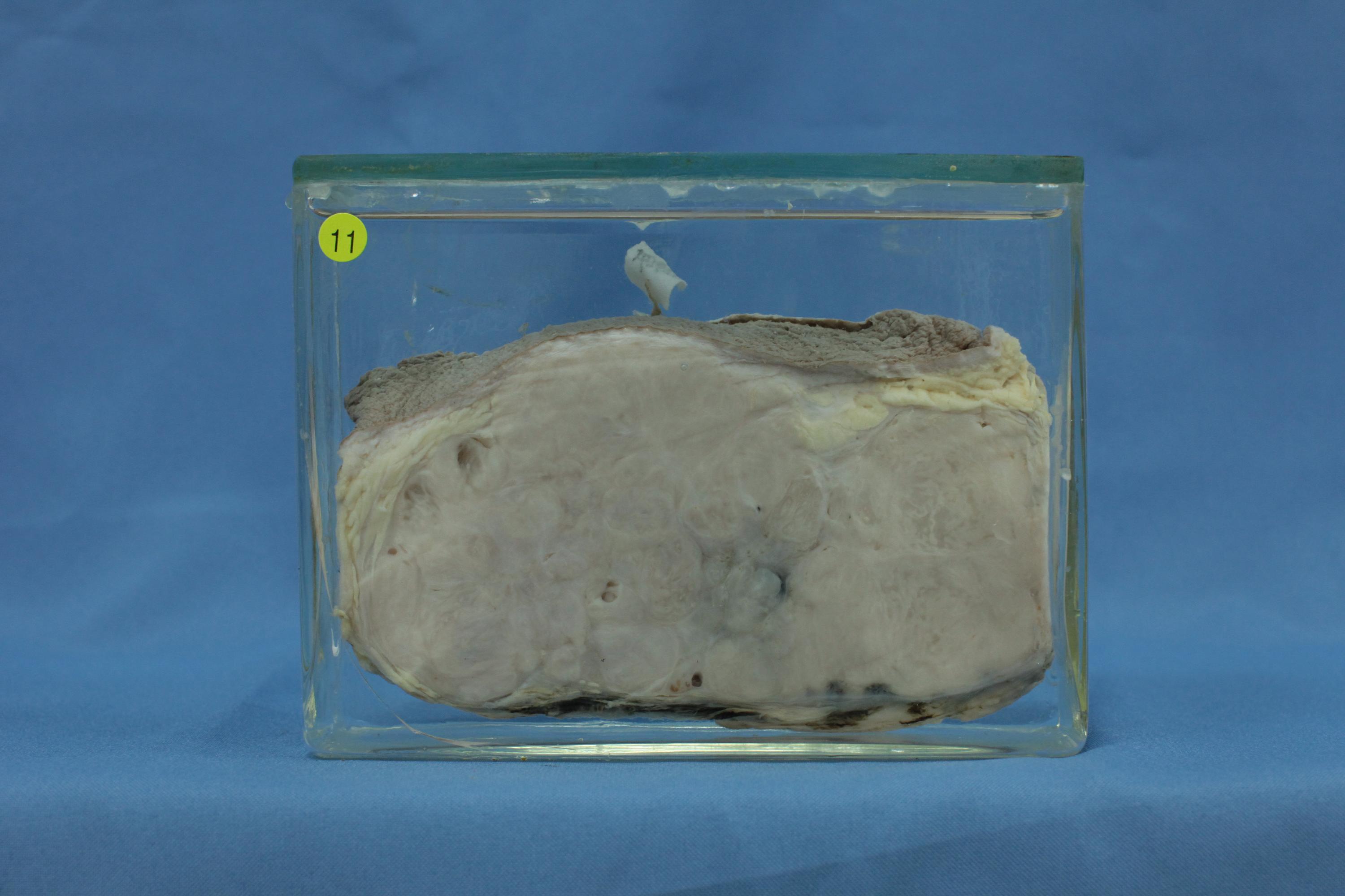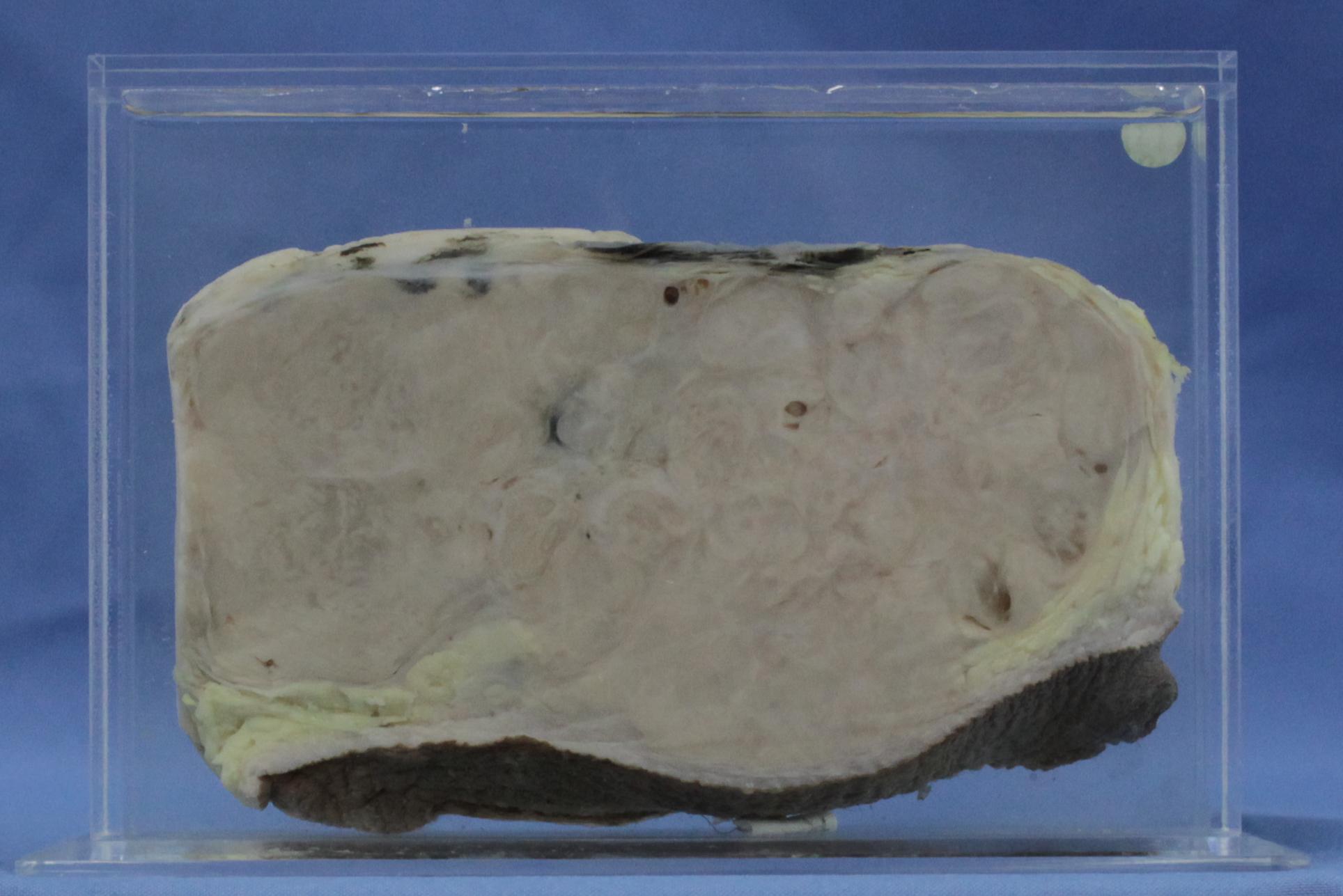 皮下可见巨大灰白色肿块一个,大小约24×15×15厘米,有完整包膜;切面结节状,质地中等;镜下为由乳腺导管及间质纤维组织增生形成的良性肿瘤。