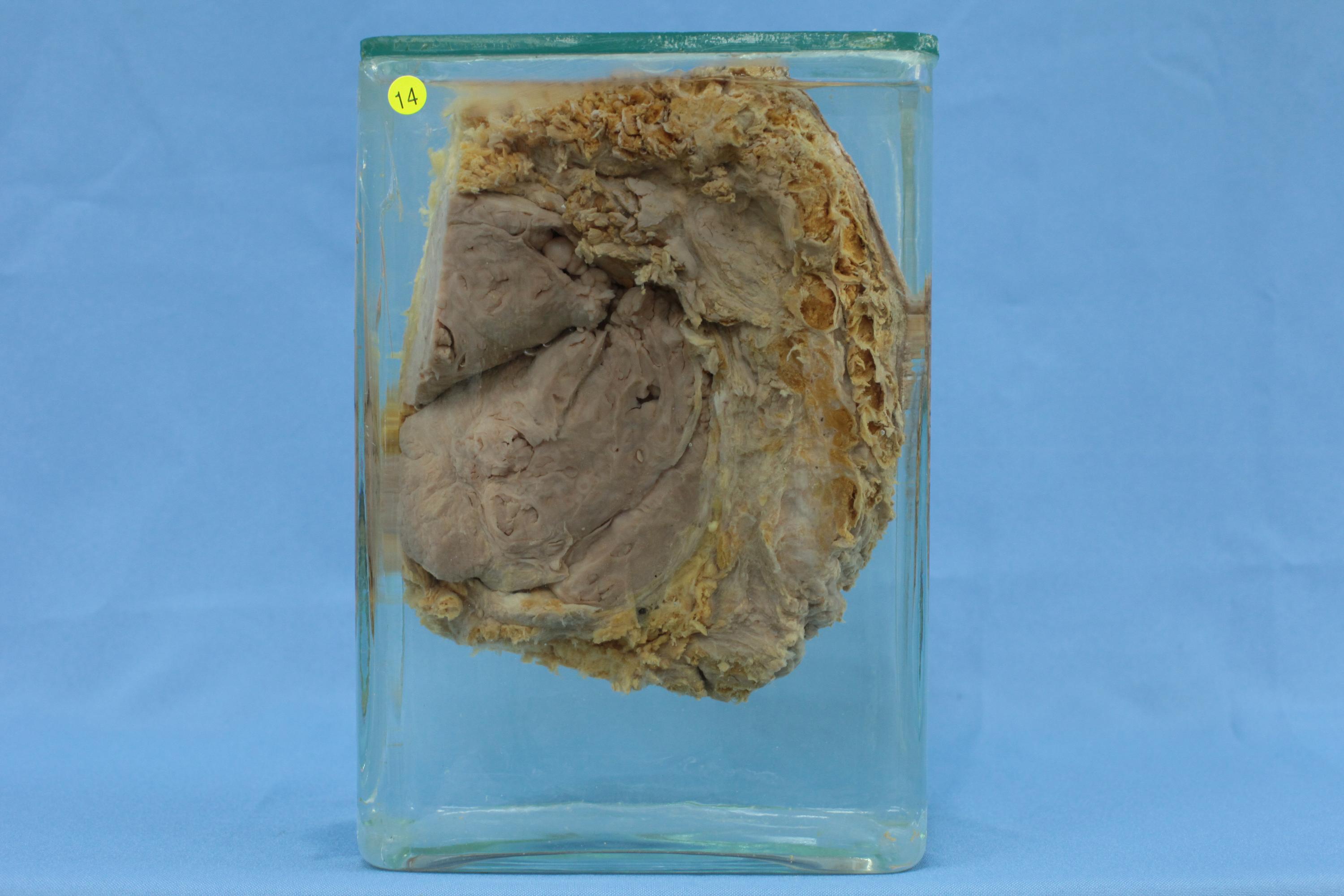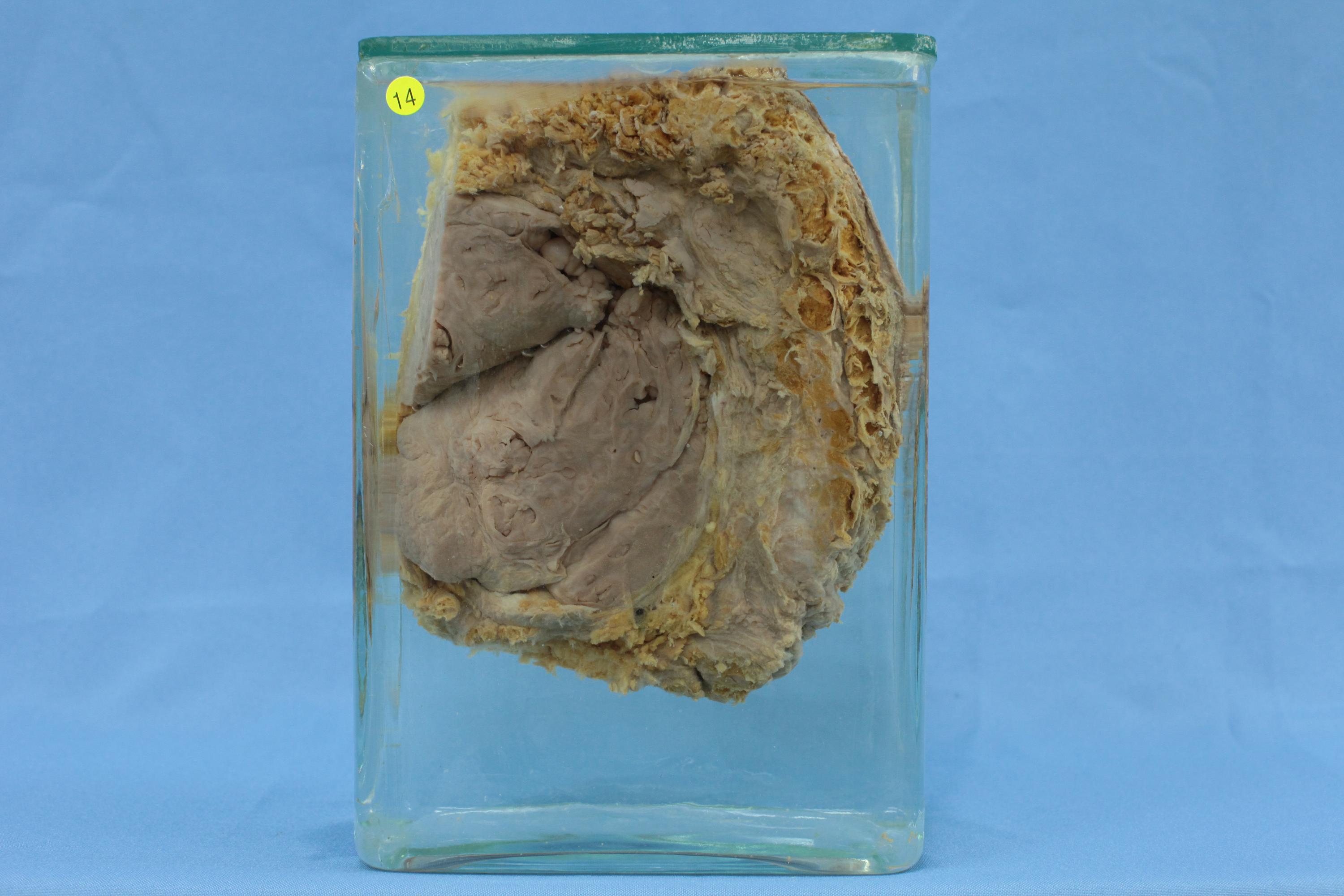 皮下乳腺组织内见一灰黄色肿块,直径约15厘米,无包膜,与周围组织境界不清;周边呈蟹足状浸润性生长;镜下为起源于乳腺导管的恶性肿瘤。