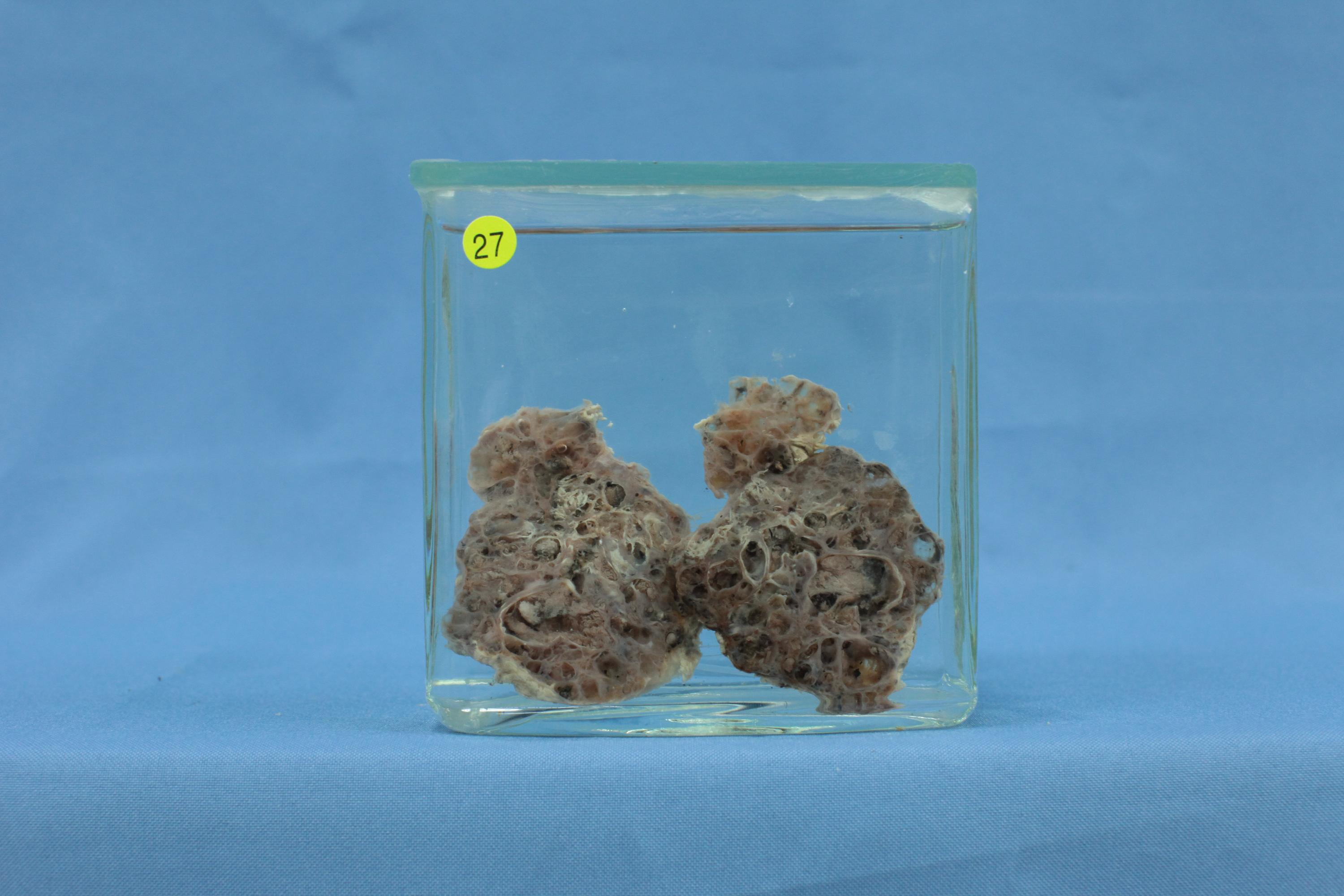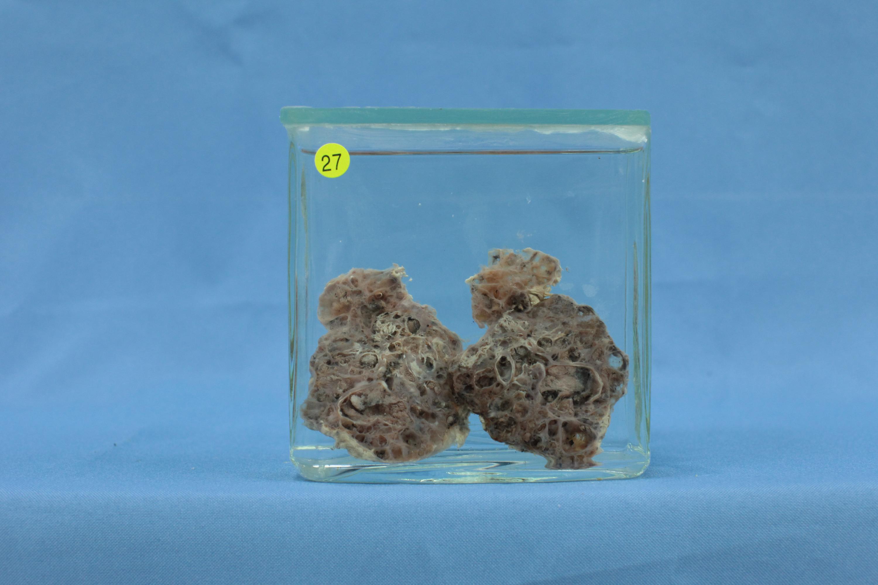 浅褐色肿块一个,大小约6×5×5厘米,部分有包膜;切面呈微囊状,小灶区含粘液样物;镜下为起源于乳腺导管的腺癌,富含粘液成分。
