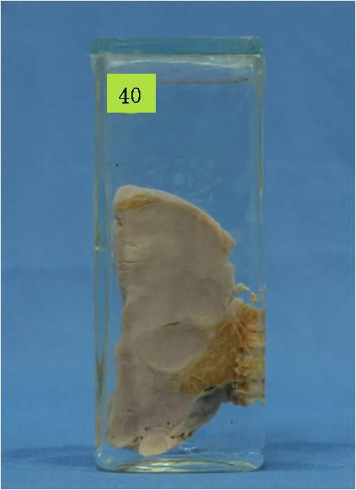 灰白色肿块一个,大小约6×4×5厘米,无包膜,境界不清;切面结节状;镜下为起源于纤维细胞的恶性肿瘤。