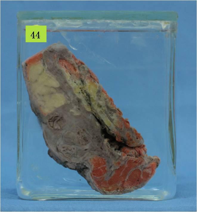 乳头下乳腺组织内见一灰白色病灶,大小约4×2.5×3厘米,切面结节状,有囊壁样结构;镜下为乳腺的化脓性炎症。