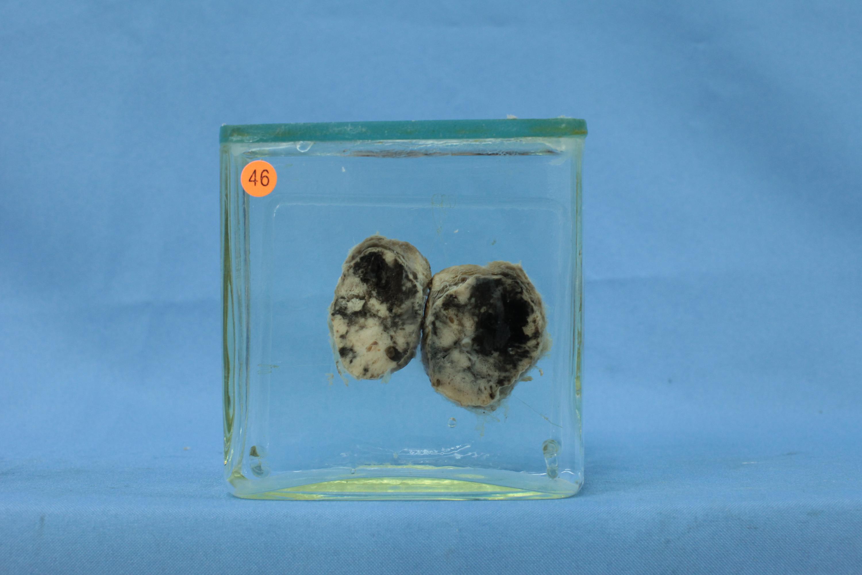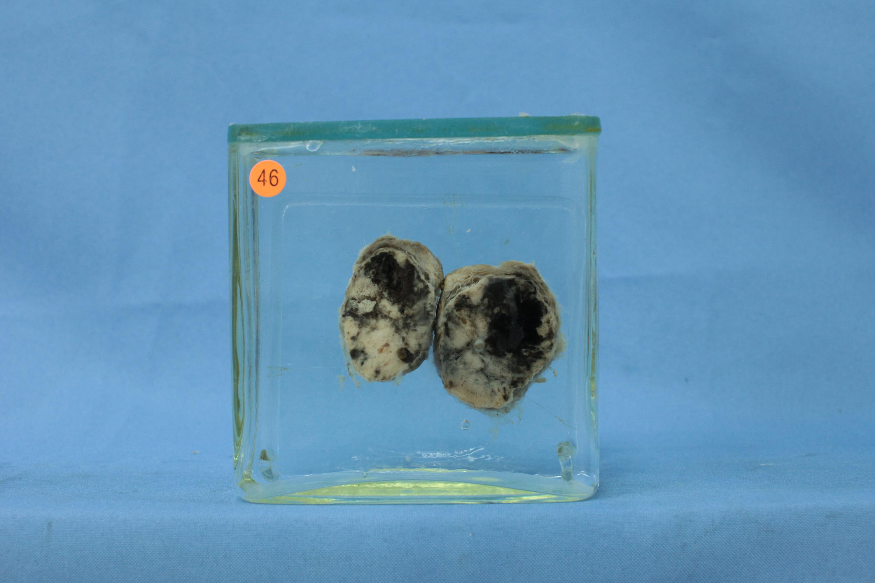 患者女,31岁,标本为甲状腺组织,切面见一直径约3cm结节,呈灰白色,有完整包膜,内有大量出血