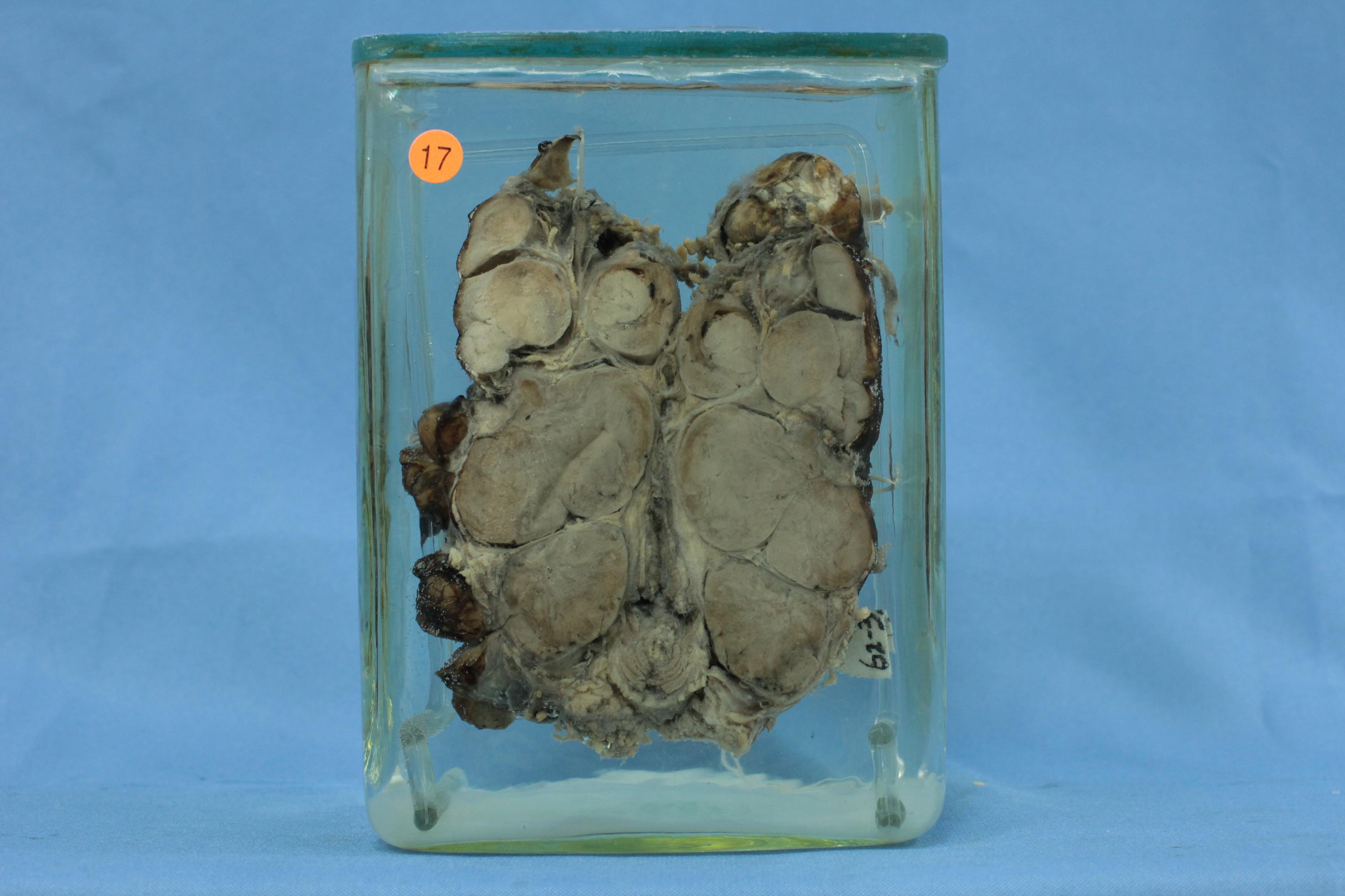 患者男,31岁,标本为部分甲状腺组织和腺瘤切除组织,见多个大小不等的圆形结节,最大直径5cm,有包膜,切面灰白,境界清。