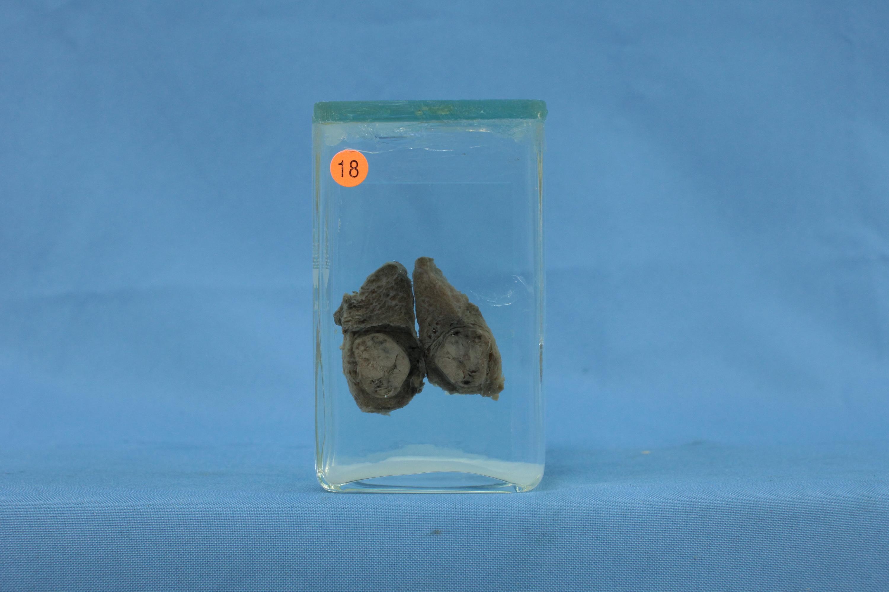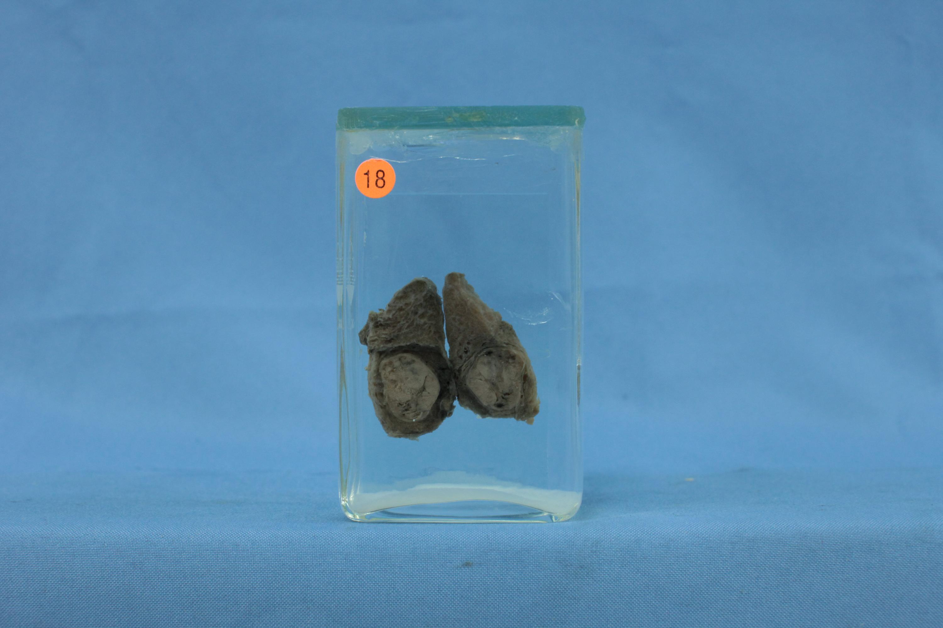 部分甲状腺组织,呈棕褐色,其中有一圆形实性结节,直径2cm,结节略呈灰白色,边界清楚,有完整包膜。
