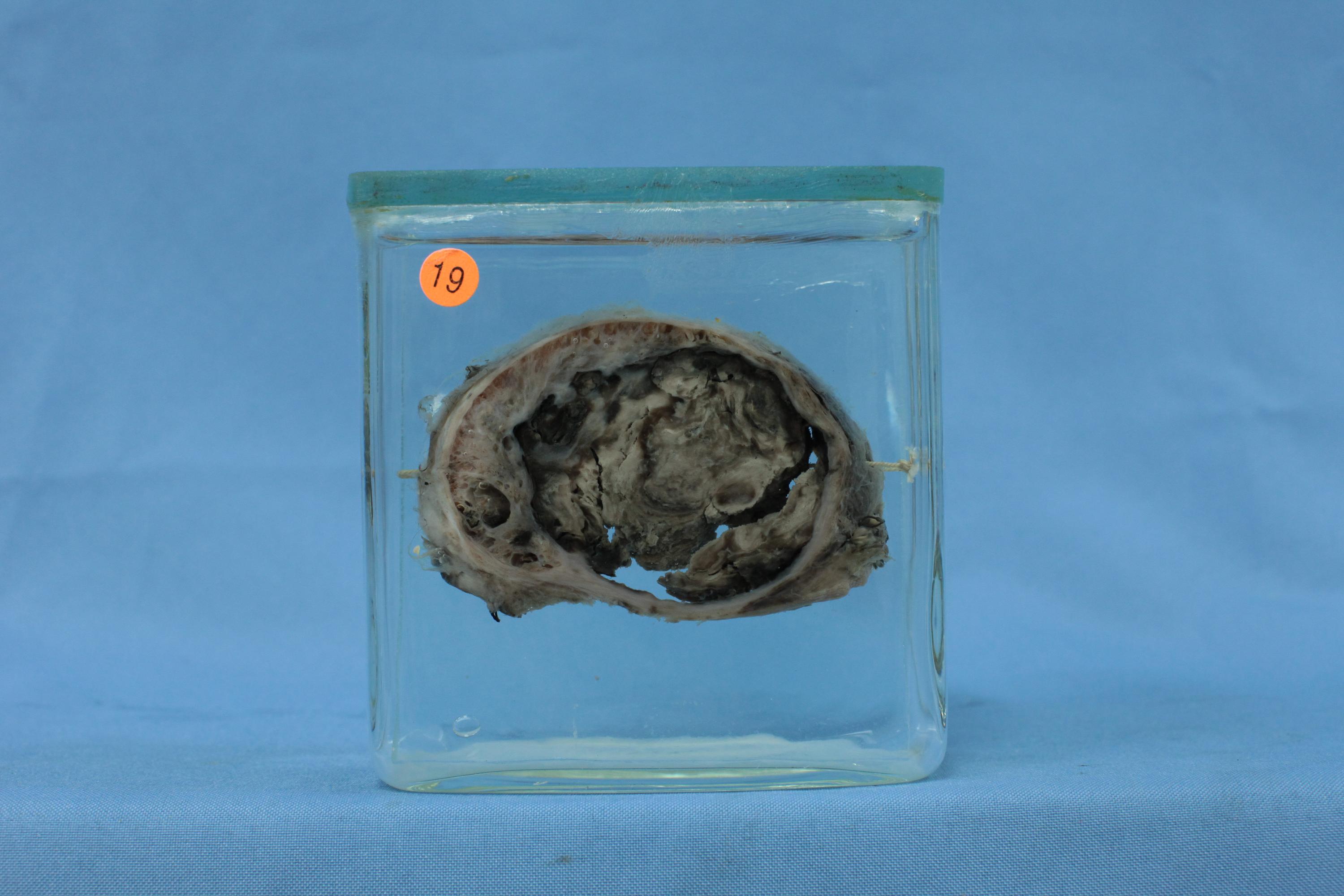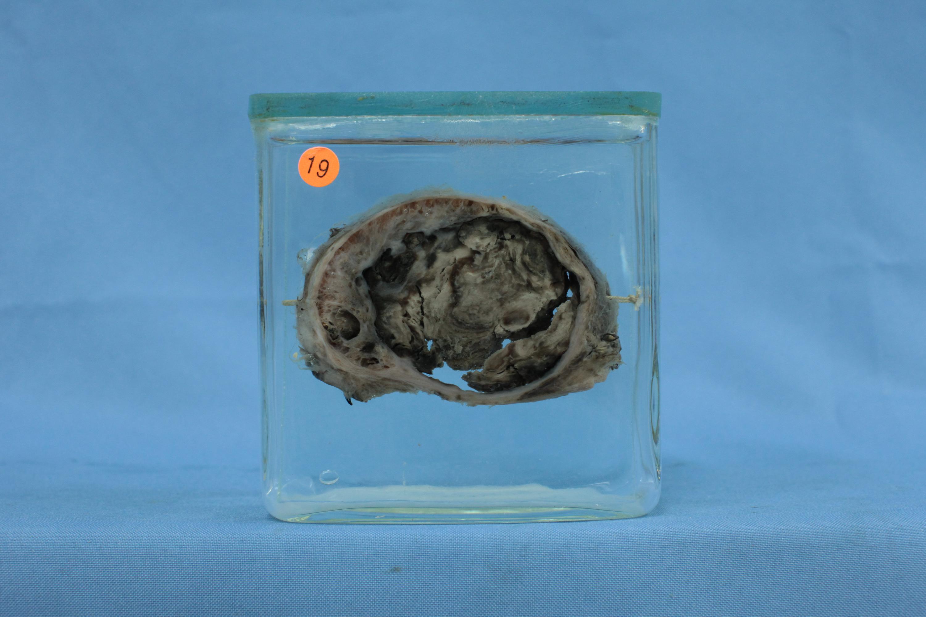 患者女,59岁,部分甲状腺组织,内见一圆形结节,直径6cm,包膜完整,质实、伴大量出血、坏死。