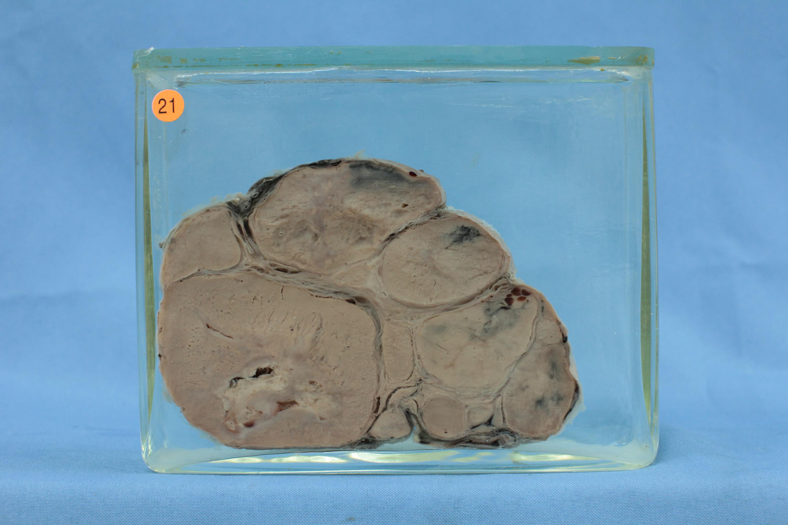 患者女,18岁,标本为巨大腺瘤组织,可见多个实性结节,直径13cm,有包膜,切面灰白,个别结节伴少量出血。