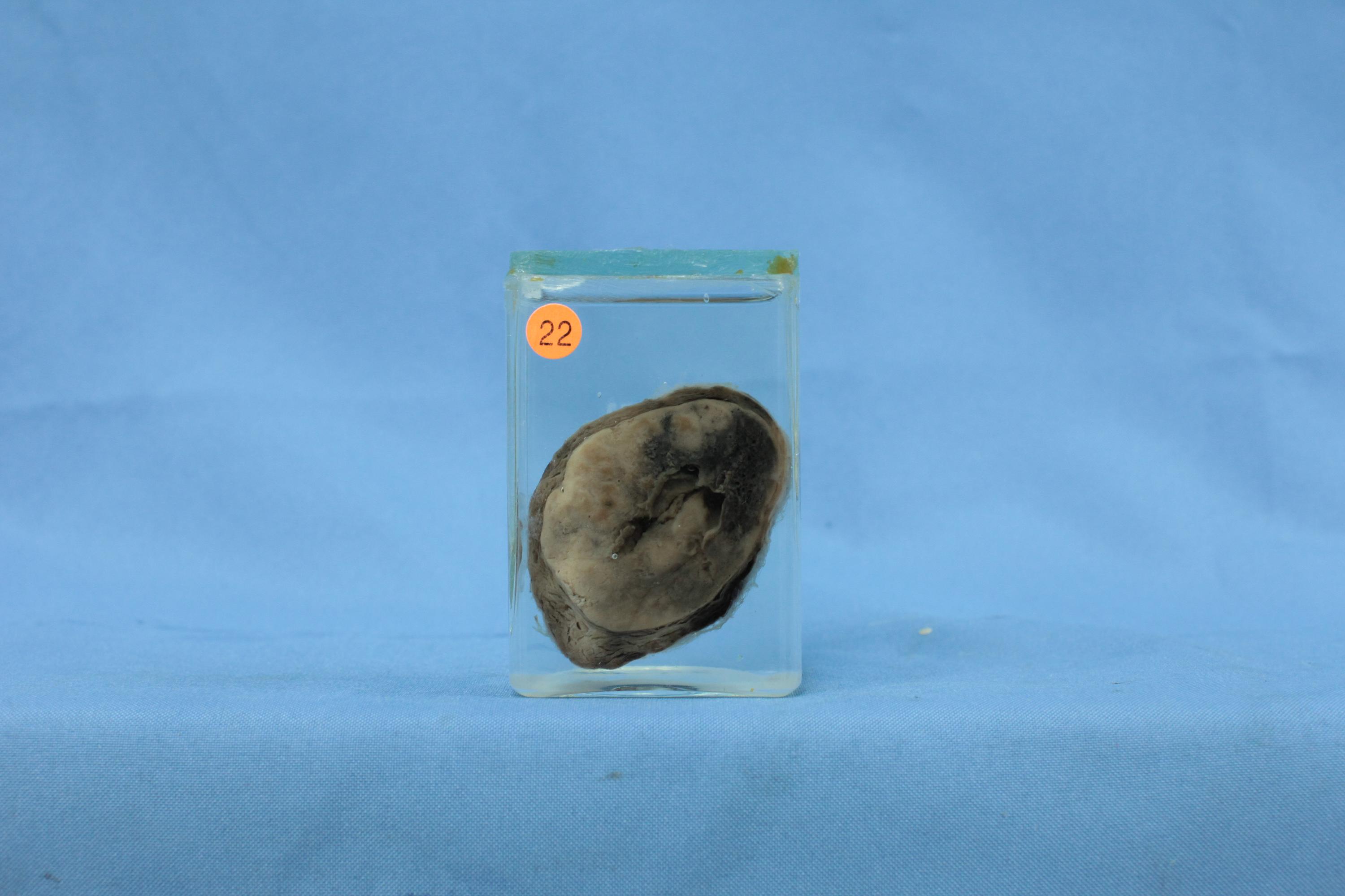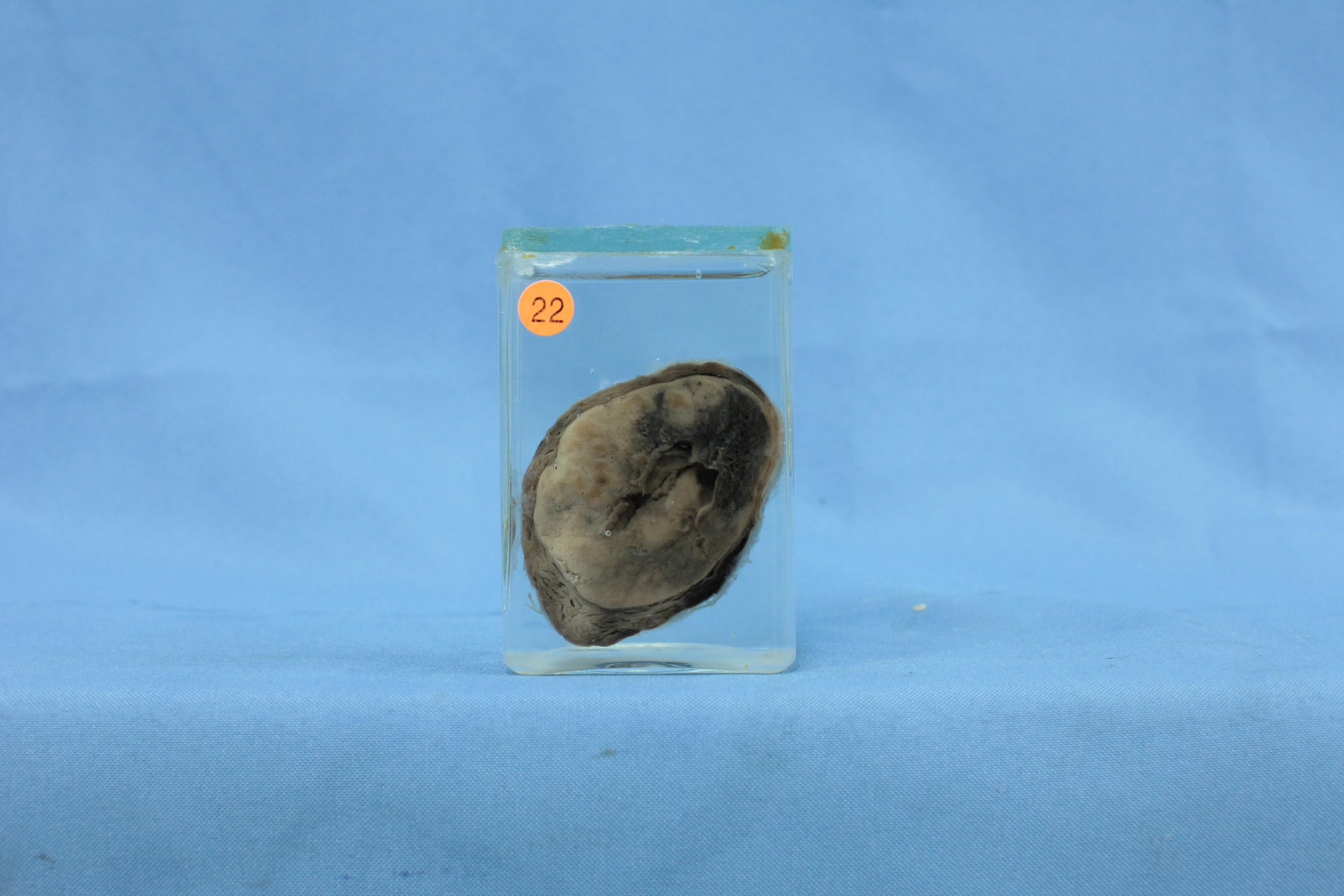 患者女,34岁,标本为部分甲状腺组织,结节圆形,直径5cm,有完整包膜,切面质实,呈灰白色,伴出血坏死和囊性变
