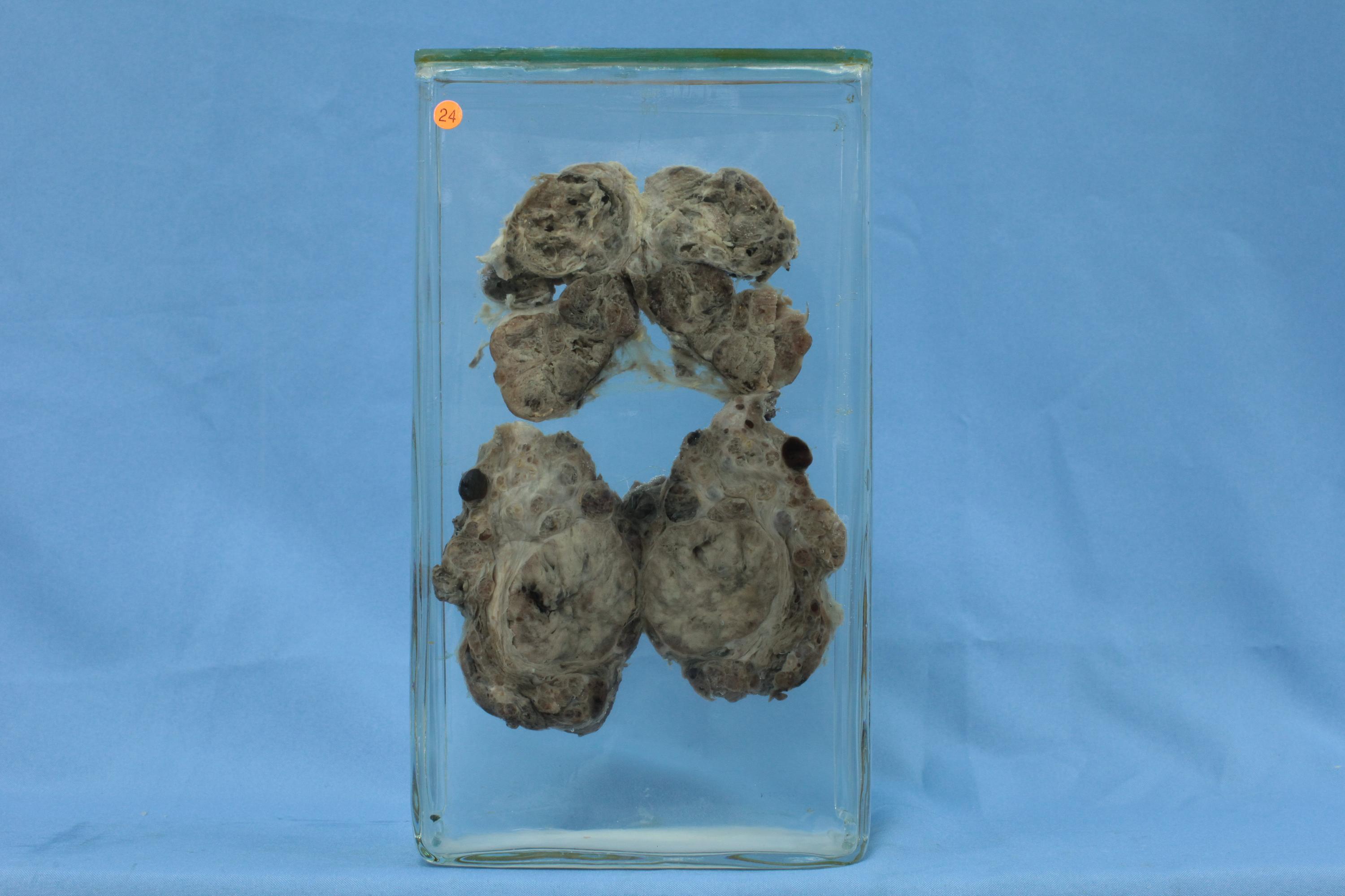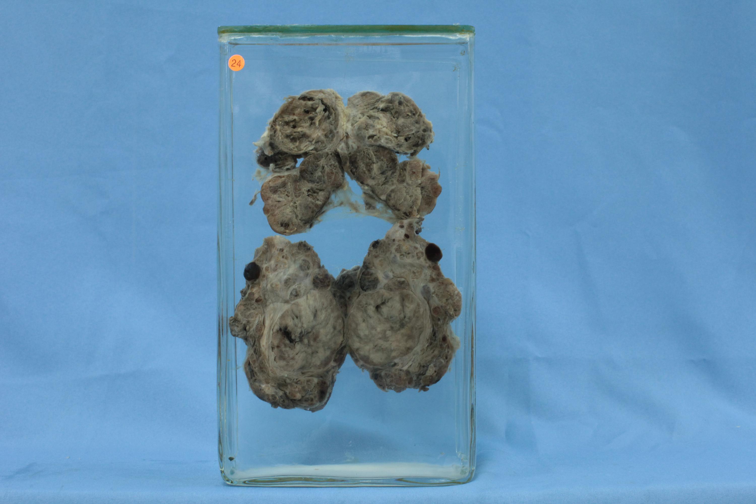 患者女,46岁,甲状腺体积增大,质地较坚实,表面呈结节状,切面呈紫红色,见一直径6cm结节,质地致密,边界清楚,有包膜,充满棕红色半透明胶性物质。