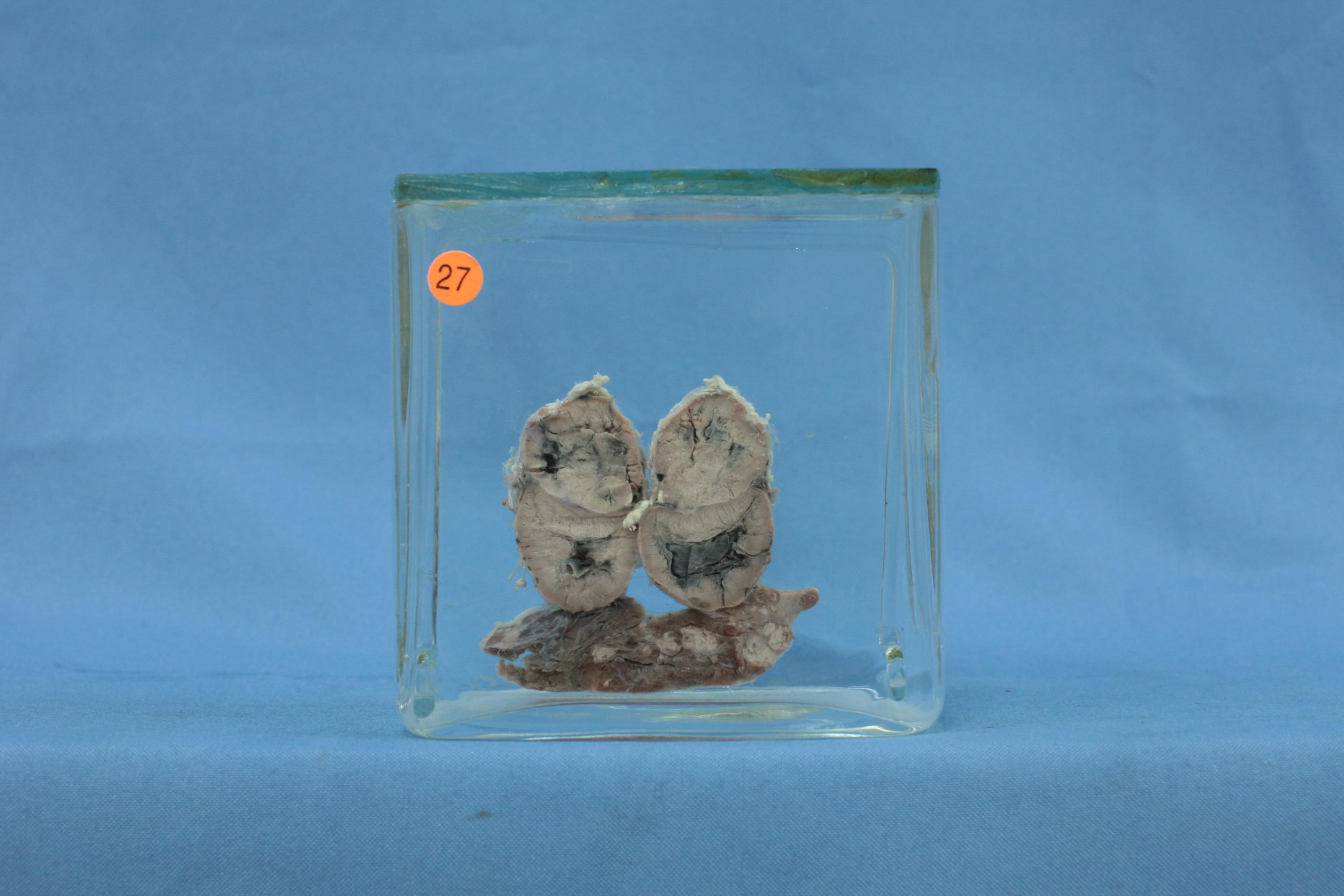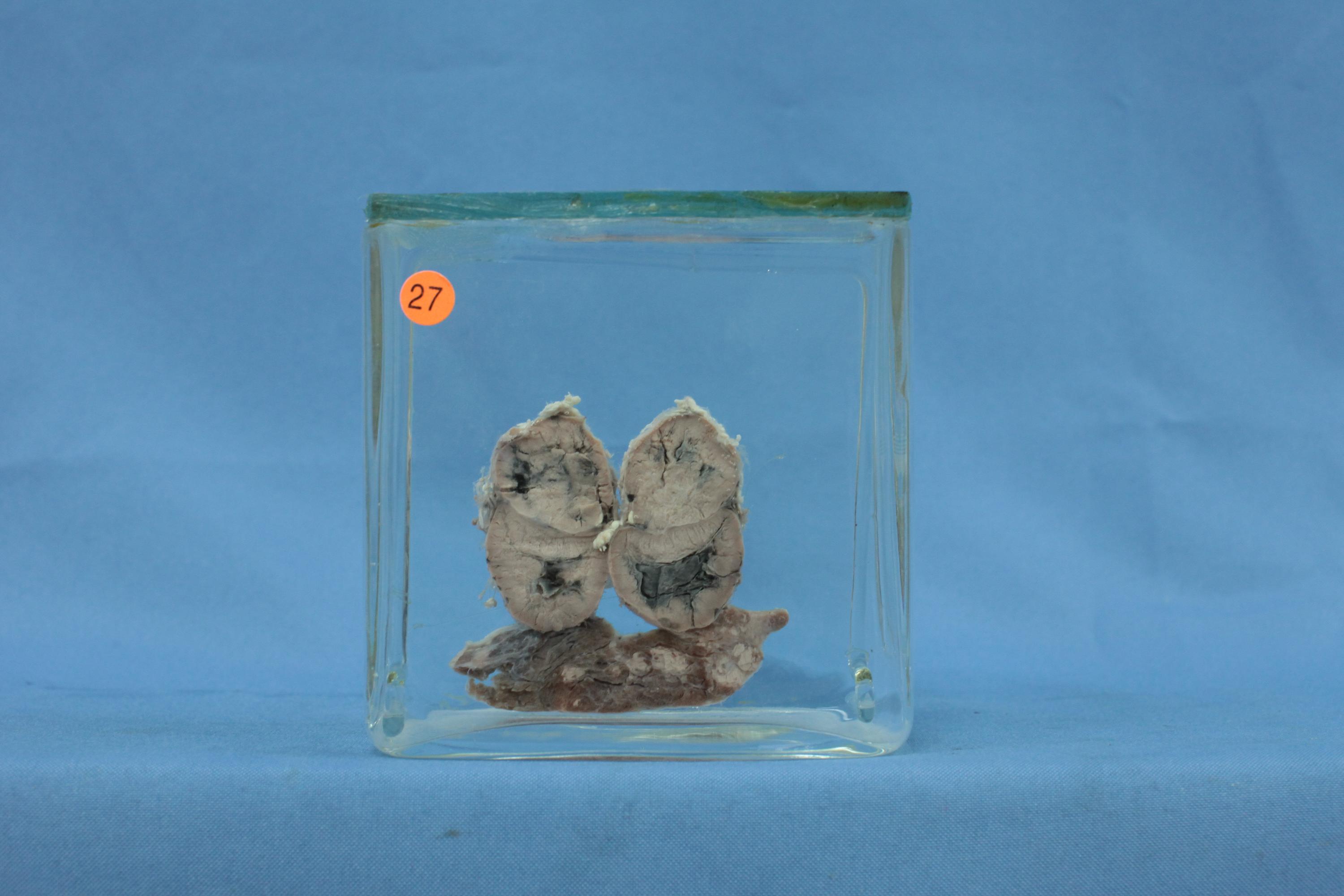 标本为部分甲状腺组织,可见卵圆形灰白色结节,质实,无明显包膜,有坏死出血。