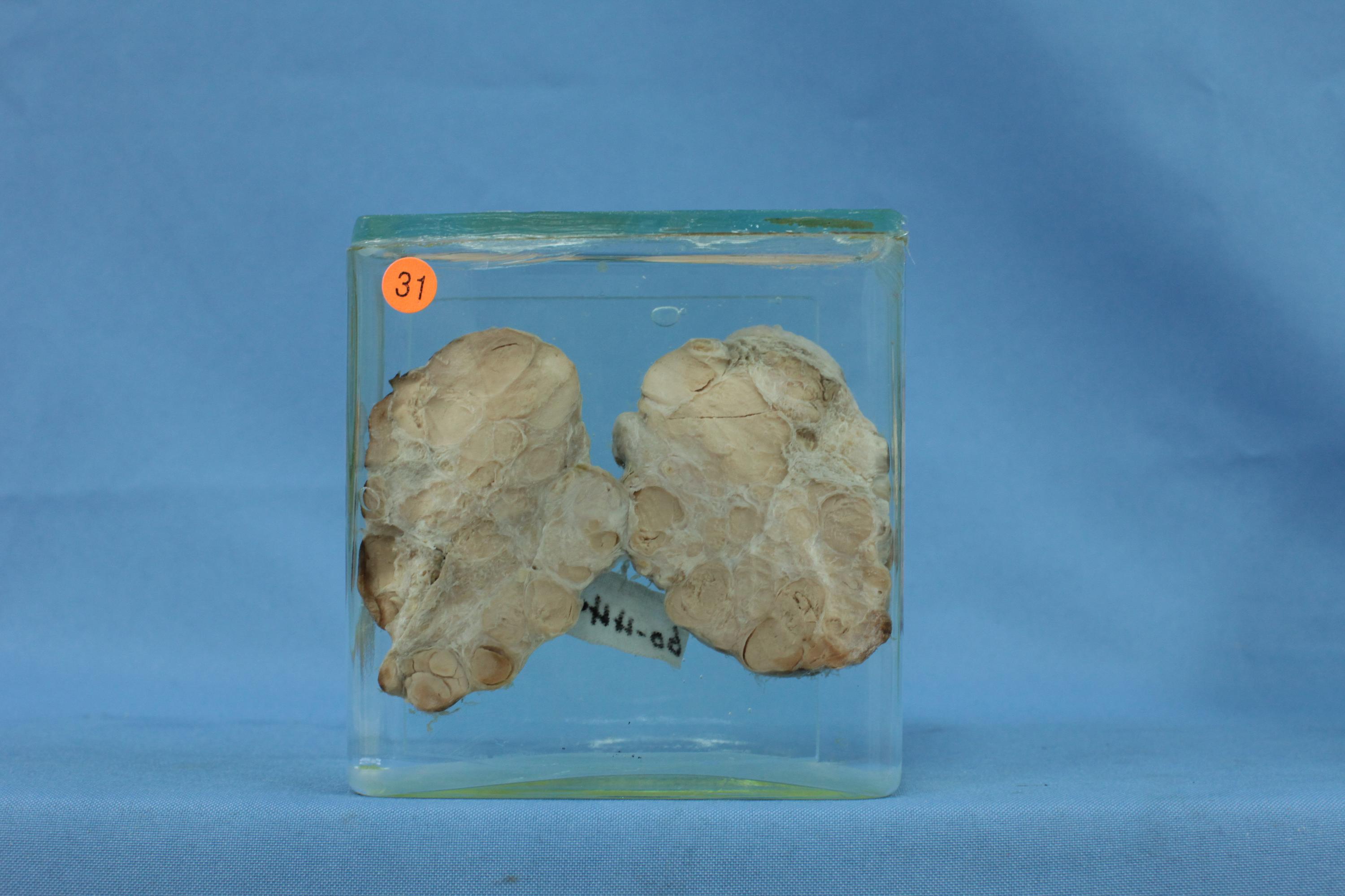 患者女,40岁,标本为切除胸腺组织,长径7cm,表面结节状,切面灰白色,呈结节状,有大量灰白色纤维间隔。