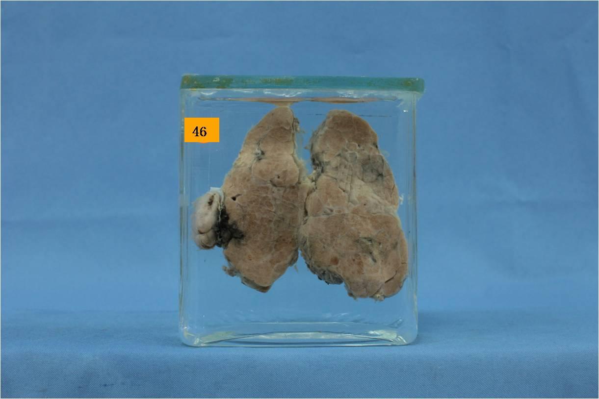 患者女,41岁,标本为两叶大小相近的甲状腺组织,外膜完整,切面暗红,伴少量出血,部分区域富含胶样物质。