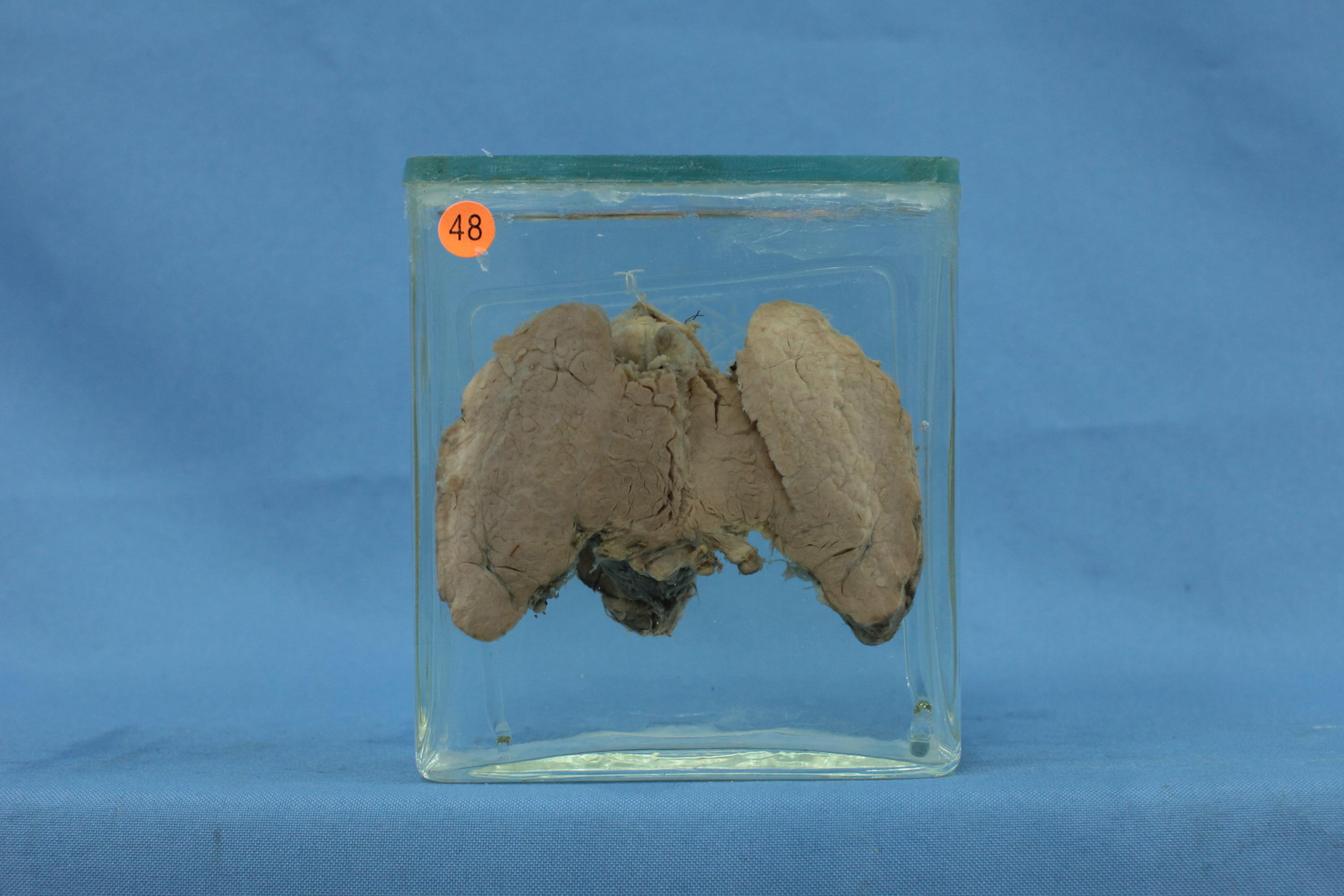 慢性淋巴细胞性甲状腺炎,又称桥本甲状腺炎。本例患者女,43岁,标本为部分甲状腺组织,甲状腺较正常增大,切面灰黄,结构致密 。
