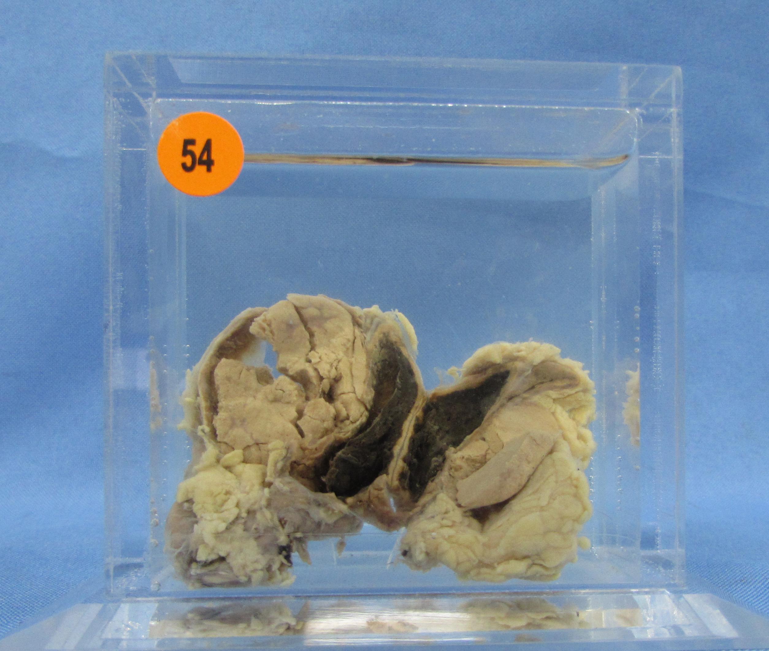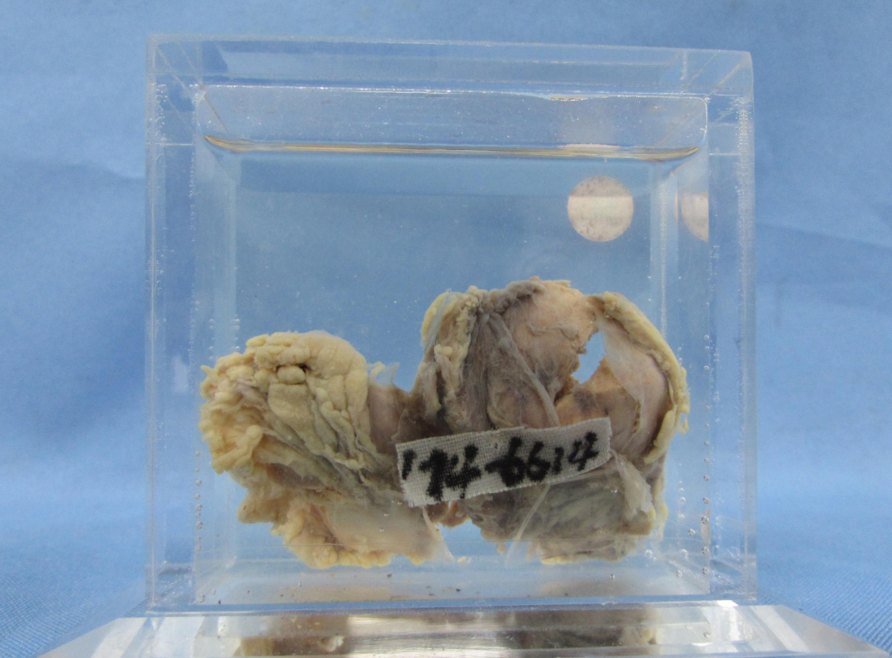 患者女,40岁,标本为腺瘤组织,切面见一灰黄色结节,边界清,质实。