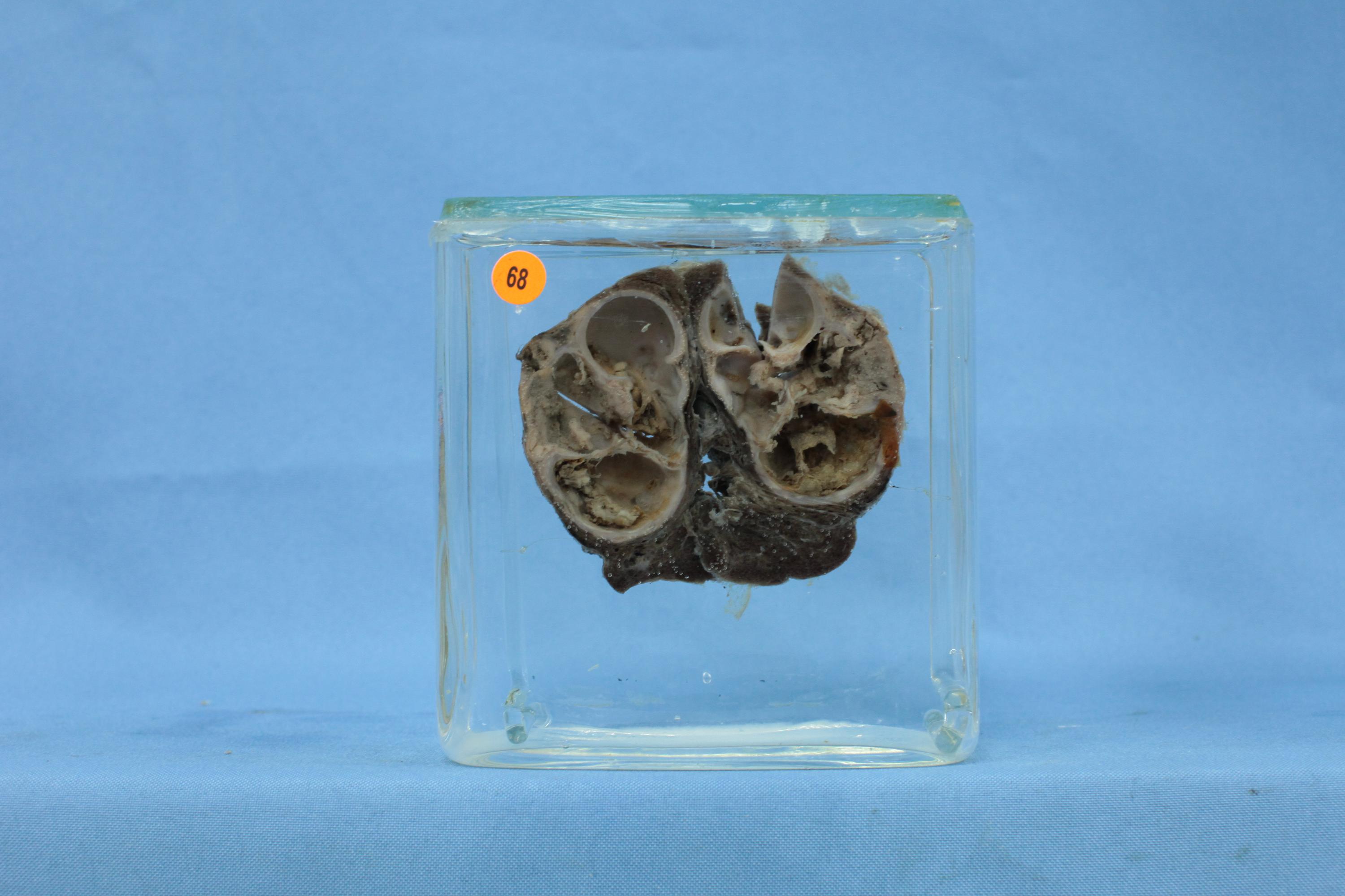 肿瘤结节直径约为5厘米,几乎占据整个睾丸,质软,灰白色。