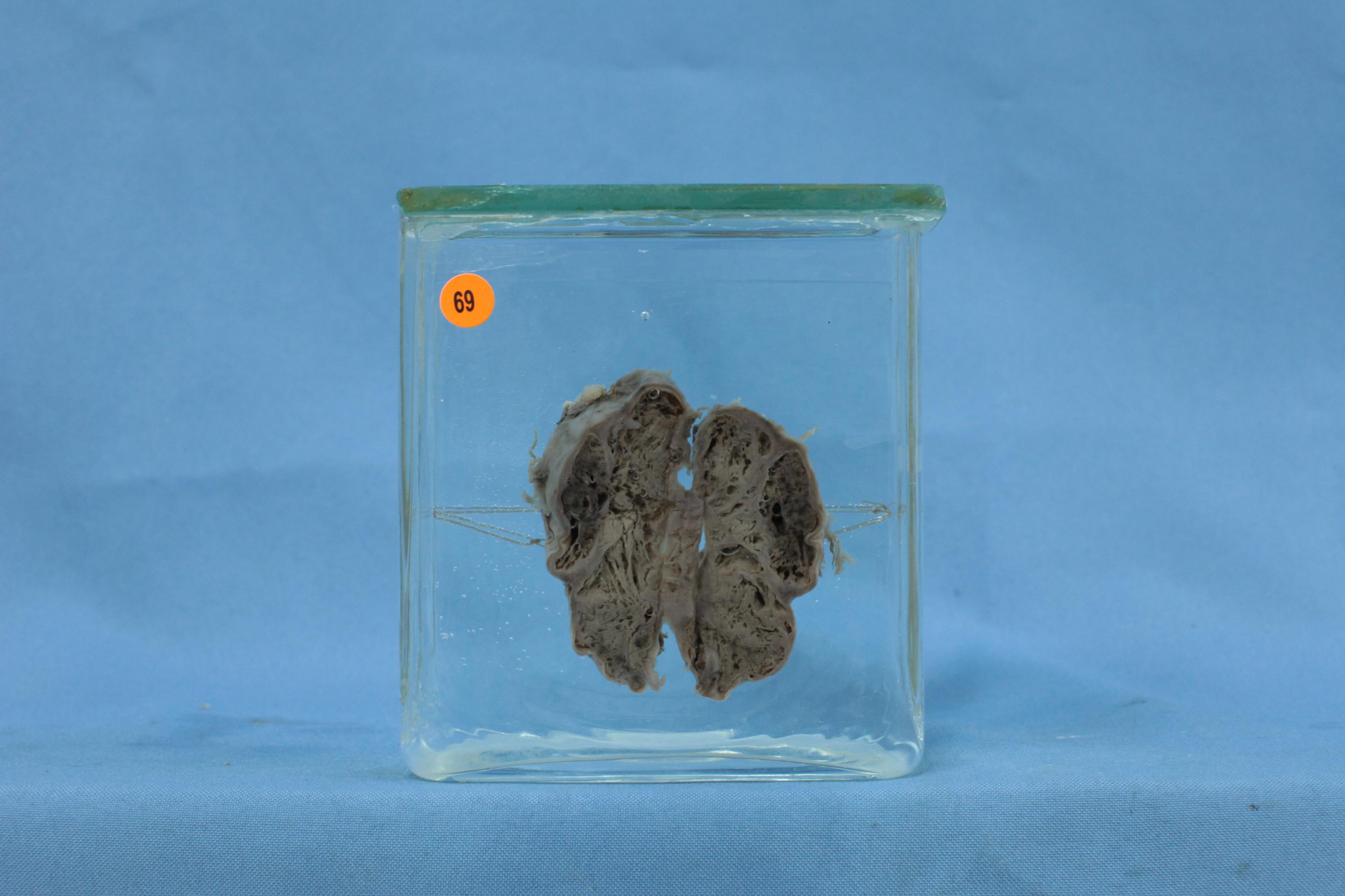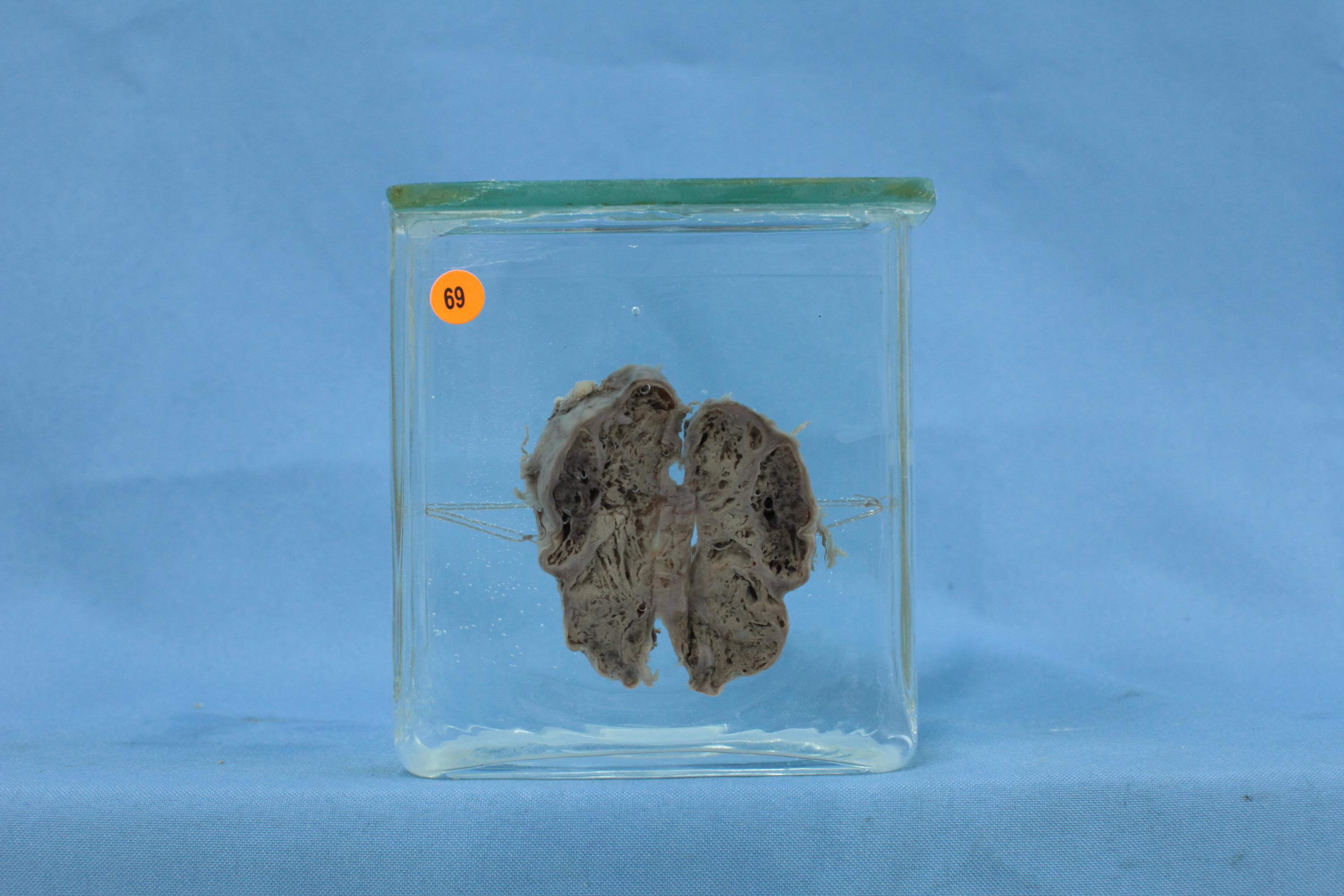 标本为肾上腺组织,切面呈灰白色,包膜完整,有大量囊腔形成伴出血坏死。