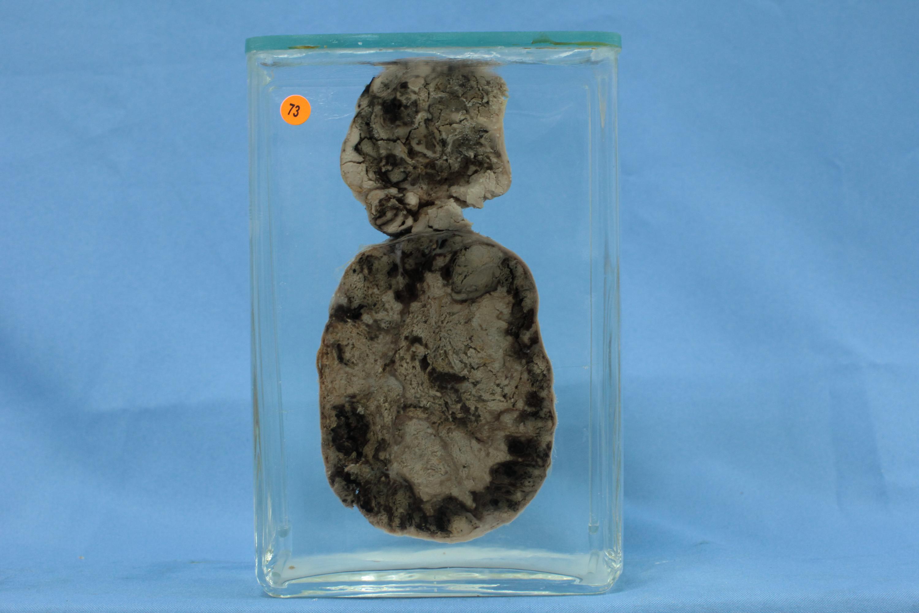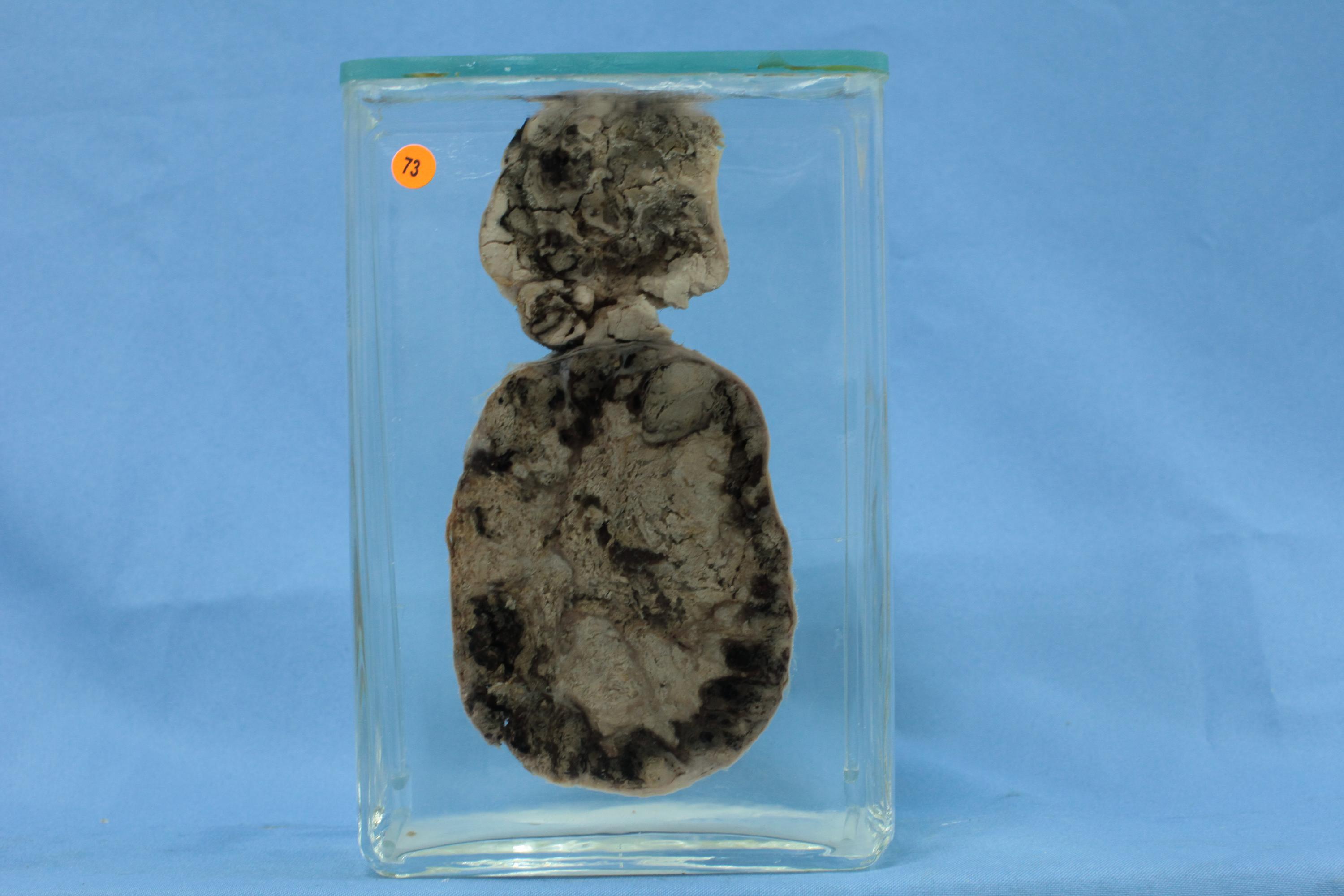标本为肾上腺组织,切面见一棕黄色分叶状结节,表面粗糙,伴有出血、坏死。