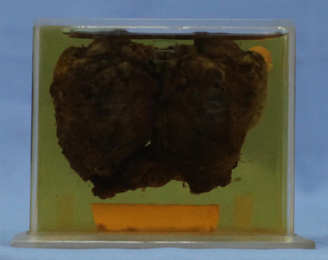 患者女,45岁,标本为肾上腺组织,切面见一灰红、质实结节,有完整包膜。