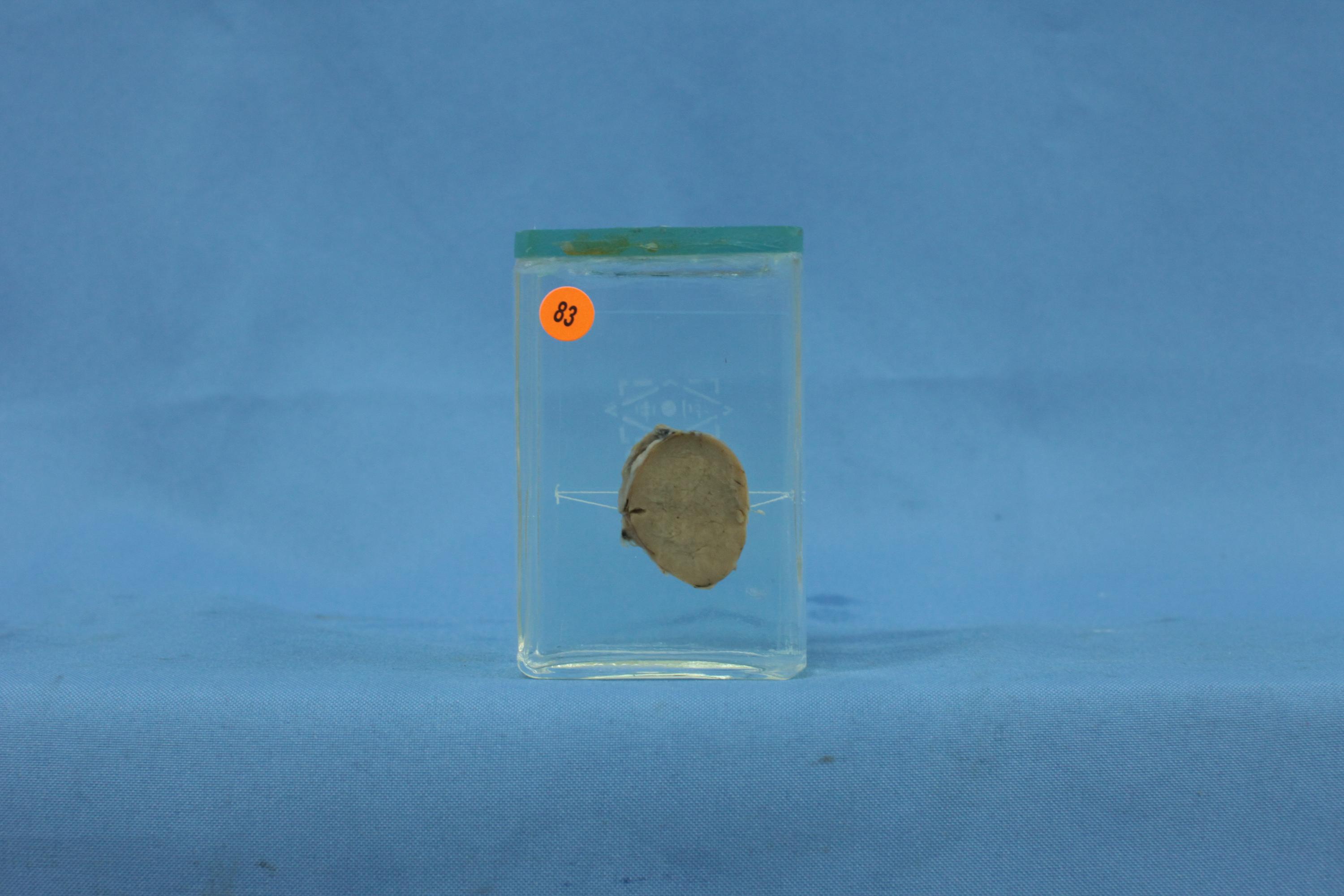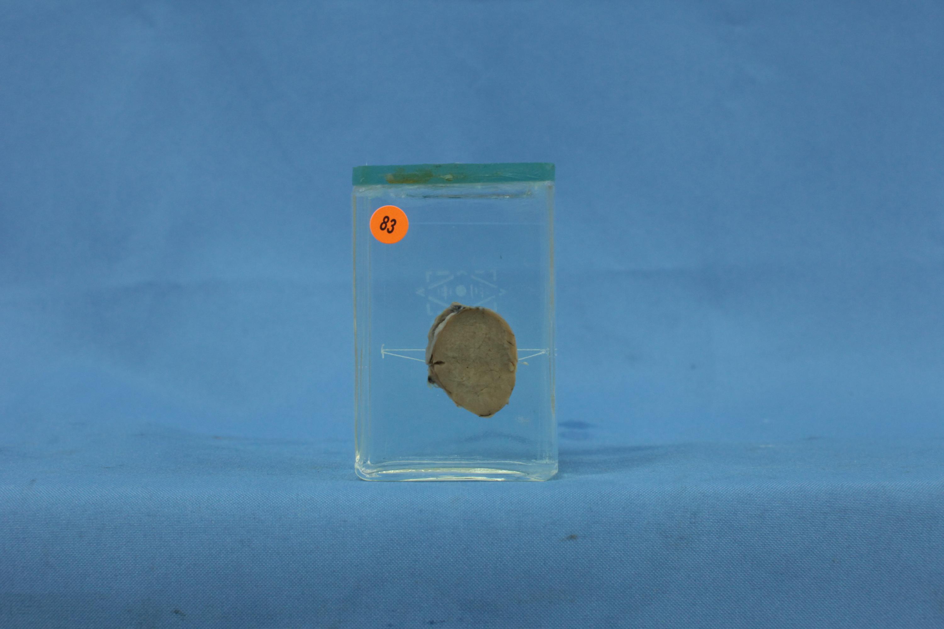 标本为胸腺组织,结节呈灰黄色,直径2.5cm,包膜完整,伴少量点状坏死。