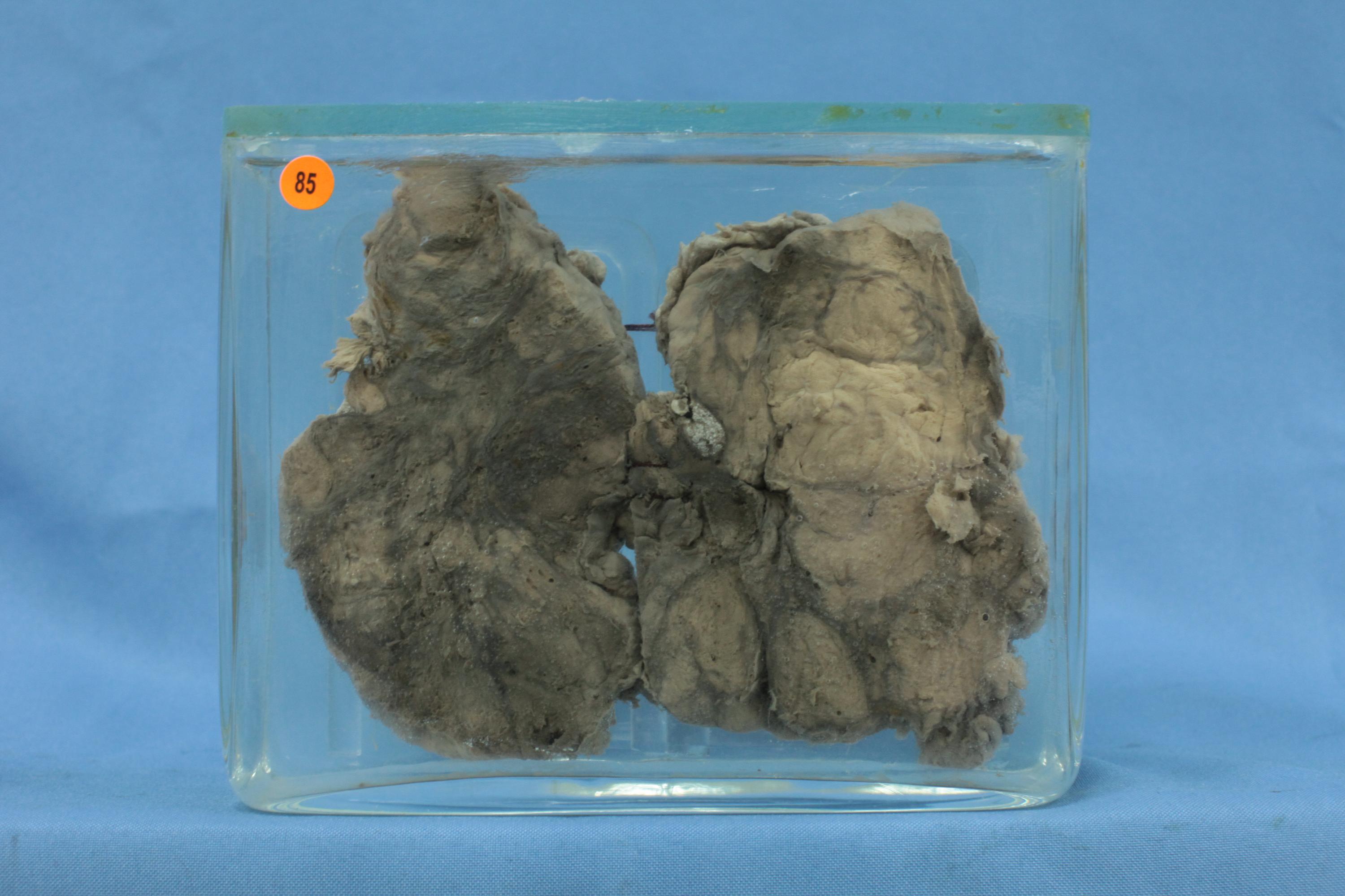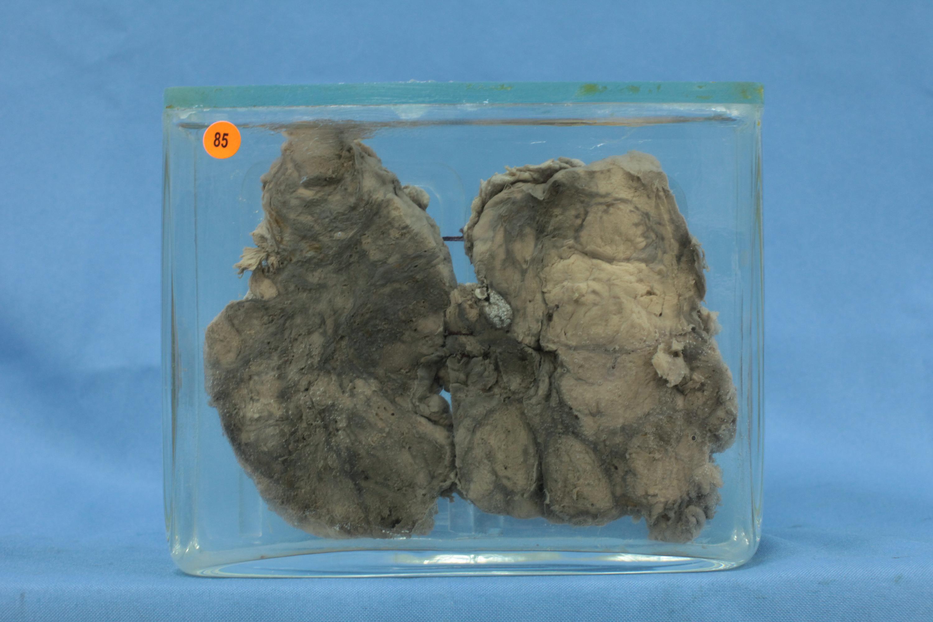 标本为胸腺组织,切面见多个结节形成,呈灰白色,有纤维间隔。