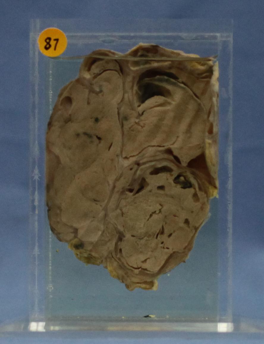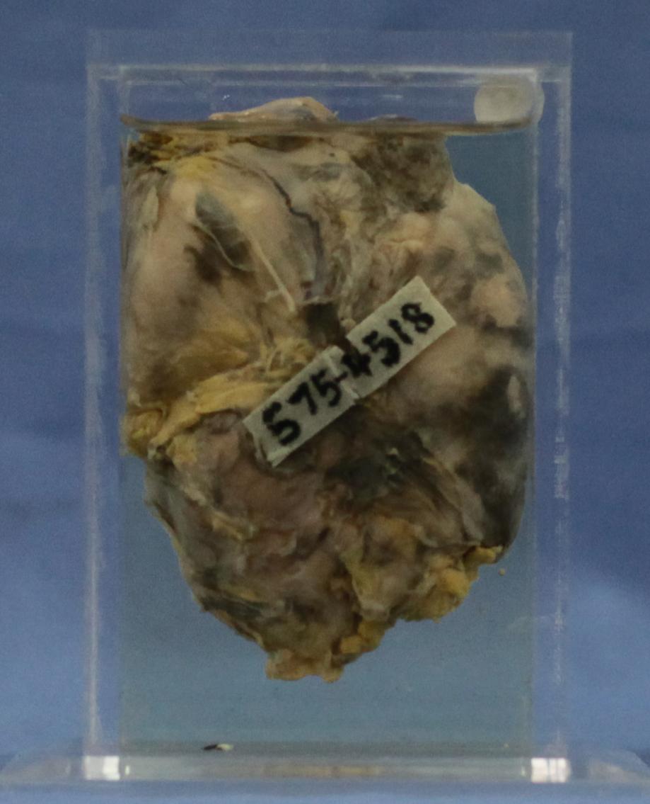 标本为胸腺组织,切面见结节被结缔组织分割成大小不一多个结节,结节呈灰白色伴出血,边界清楚,部分伴囊腔形成。表面略成分叶状。
