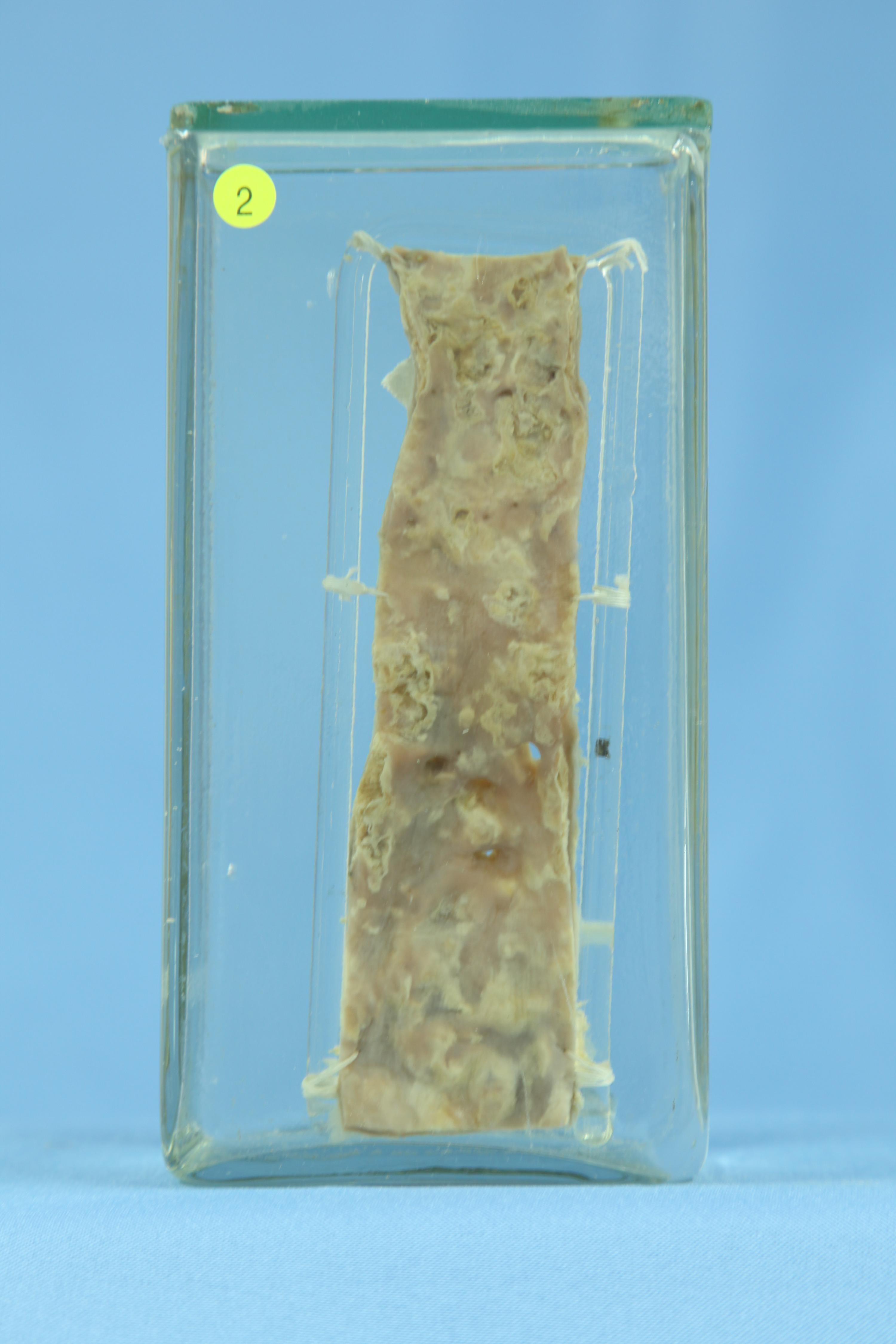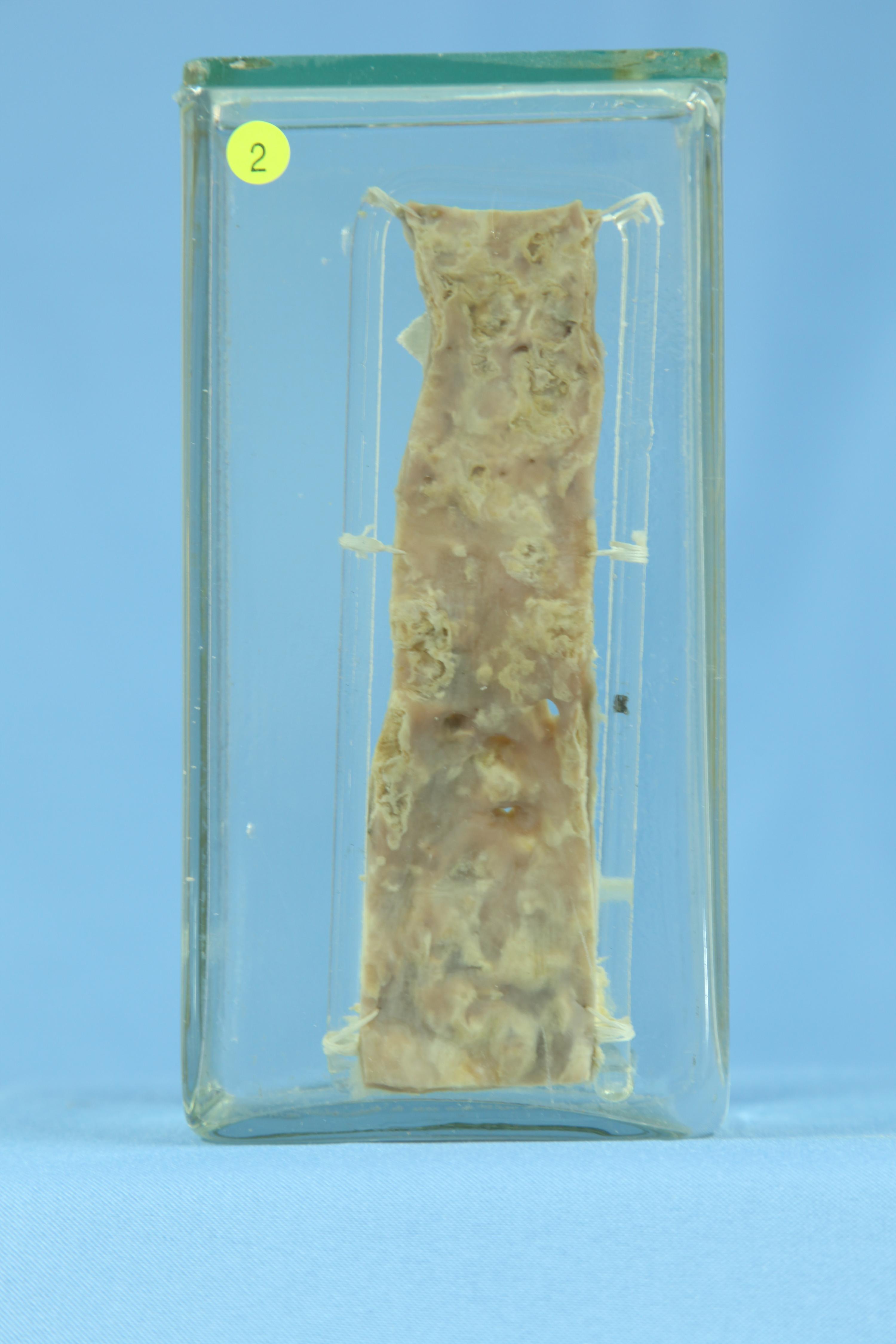 患者男性,66岁。主动脉一段,动脉内膜面有散在的浅黄色斑纹,微微高出表面,为主动脉粥样硬化早期病变。可见内膜上有钙化、溃疡形成(复合病变)。另见内膜上大小不等的黄白色蜡滴状的突起纤维斑块,系脂质沉积和纤维增生反复交替发生的结果。主要围绕小动脉分支开口处。