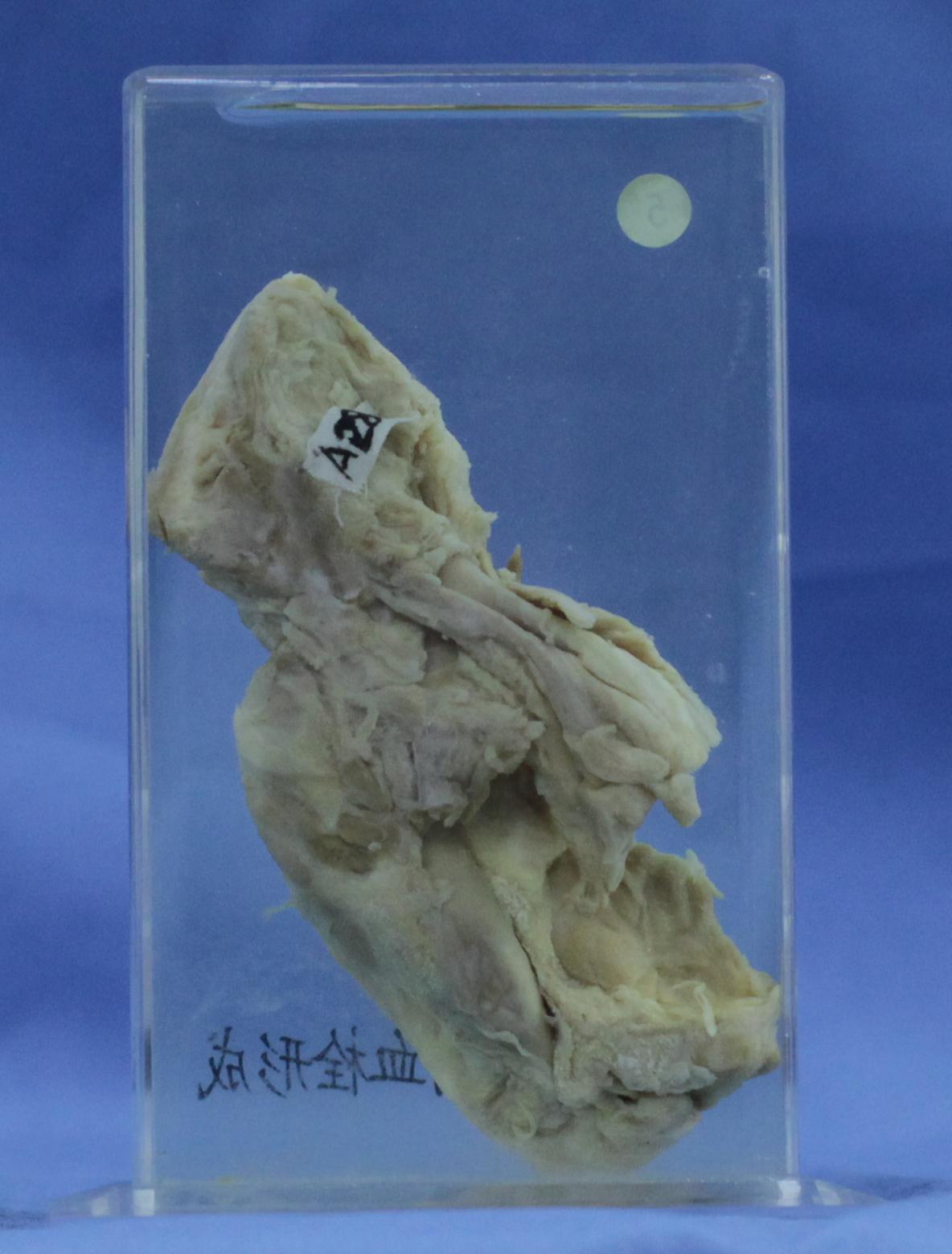 患者男性, 42岁. 晚期血吸虫病, 腹水. 标本所示为脾静脉,见血管腔内有灰白色粗条状表面粗糙、干燥而无光泽的固体质块,血管腔略扩张,内膜粗糙,与血栓块紧密粘附。