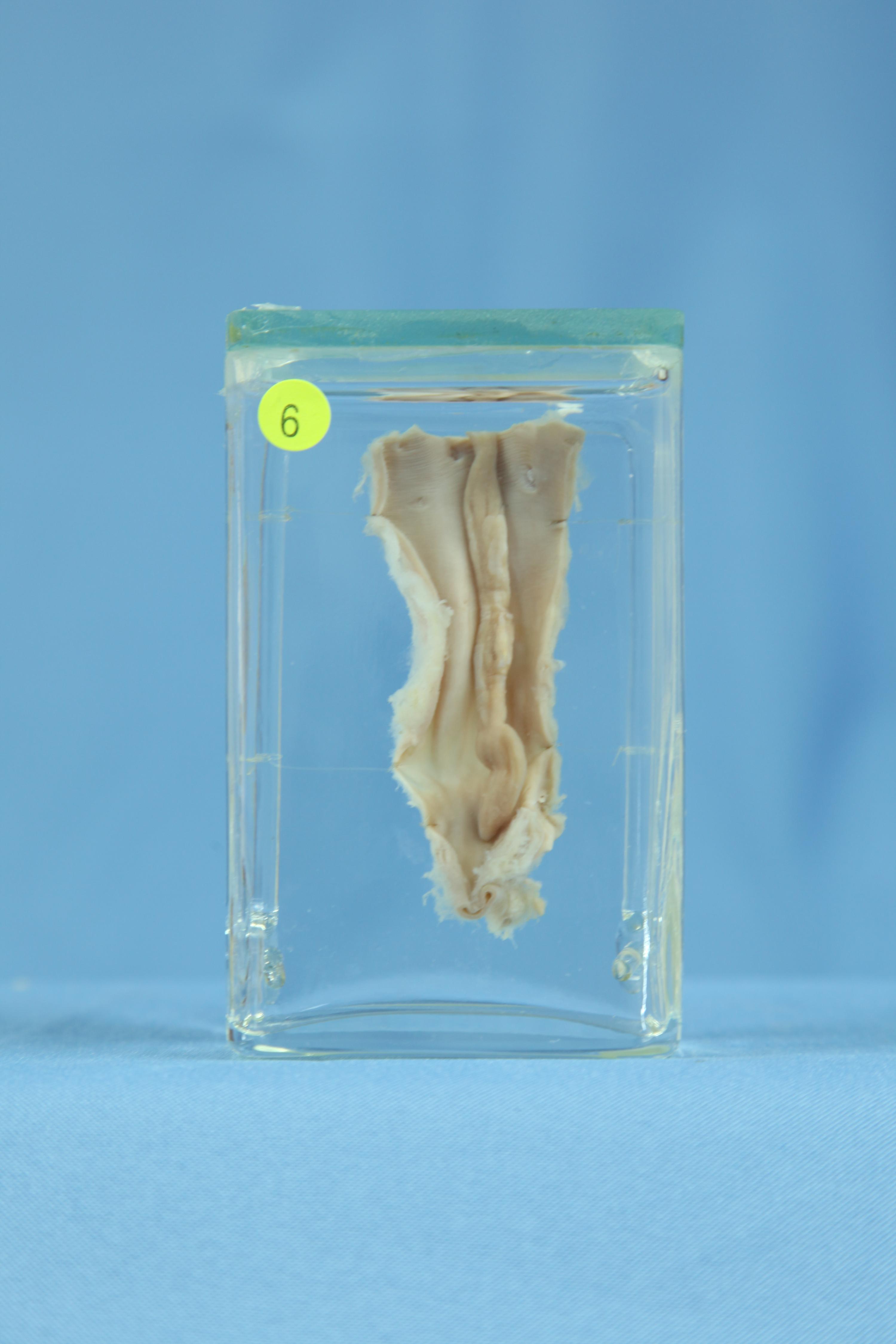 患者女性,39岁,子宫绒毛膜上皮细胞癌。标本为一段下腔静脉,管腔已被剪开,腔内可见有一根细长圆柱状血栓,色灰白, 中间段夹杂有浅褐色结构。
