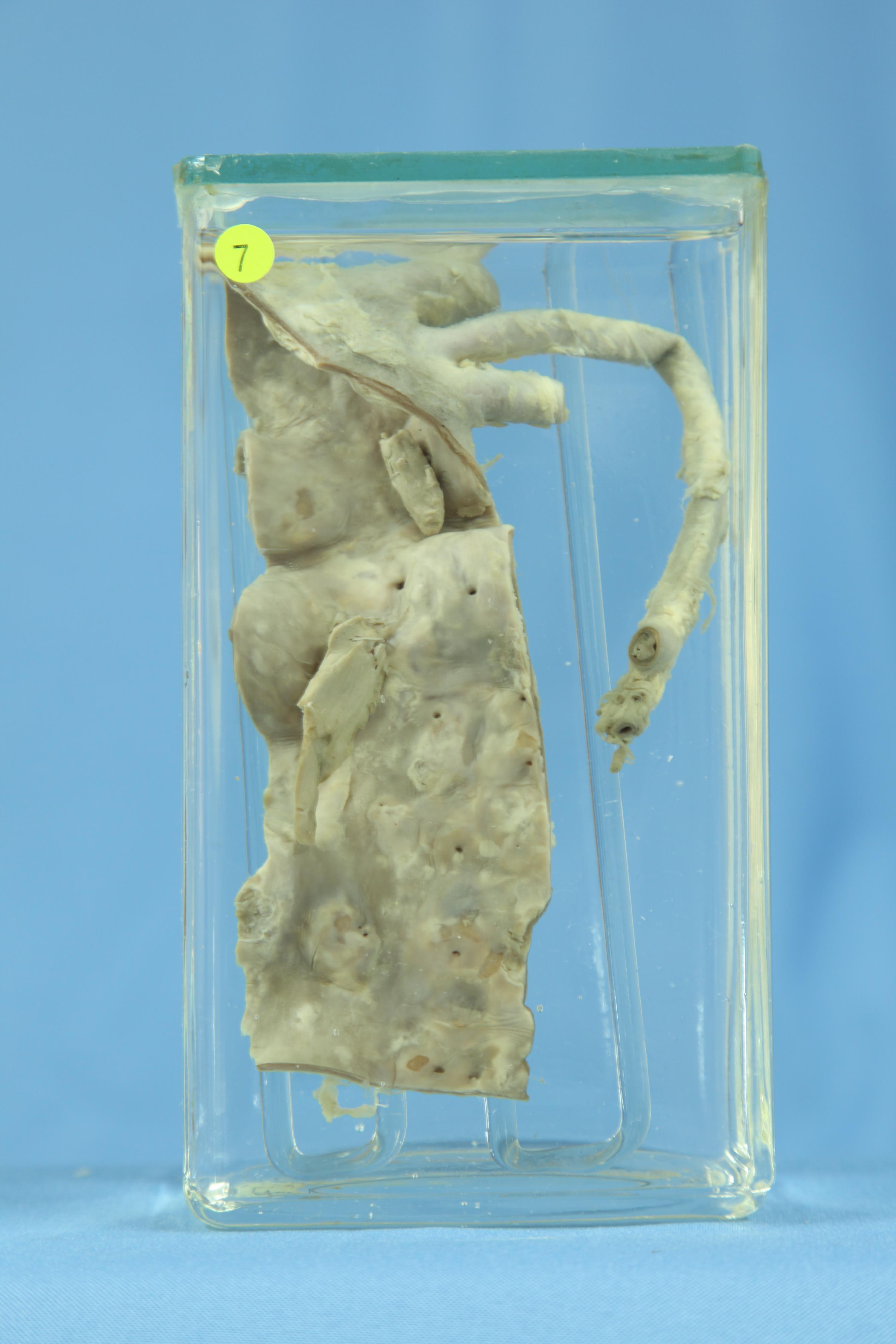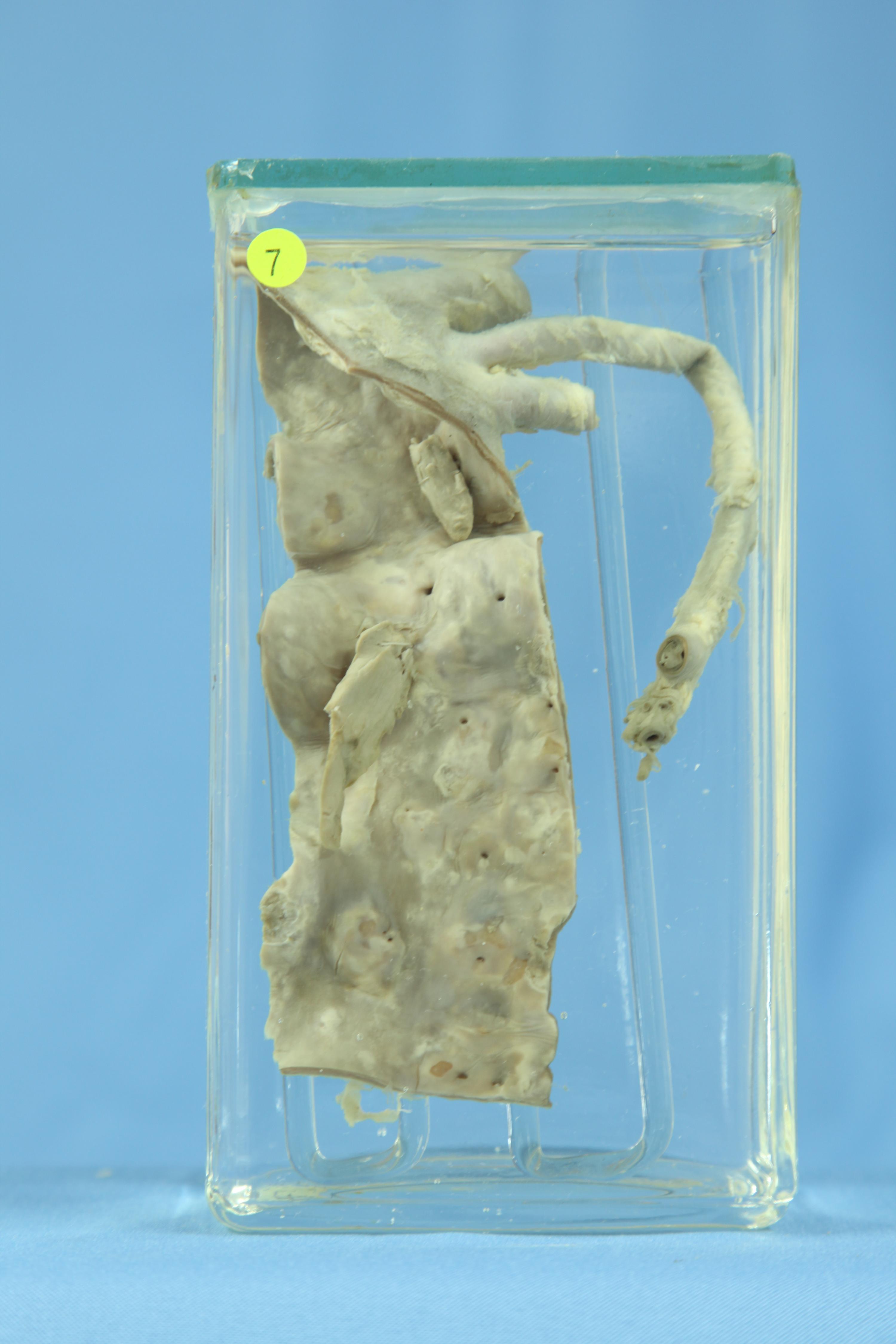 患者女性, 71岁, 胸主动脉一段标本,动脉内膜面有大量不规则灰黄色斑块分布, 高出内膜表面,表面高低不平,主要围绕小动脉分支开口处。上端主动脉弓见头臂干,左颈总动脉,左锁骨下动脉三支动脉分支,切面见动脉分支中有血栓堵塞管腔。主动脉部分小动脉分支开口处也有附壁血栓形成。