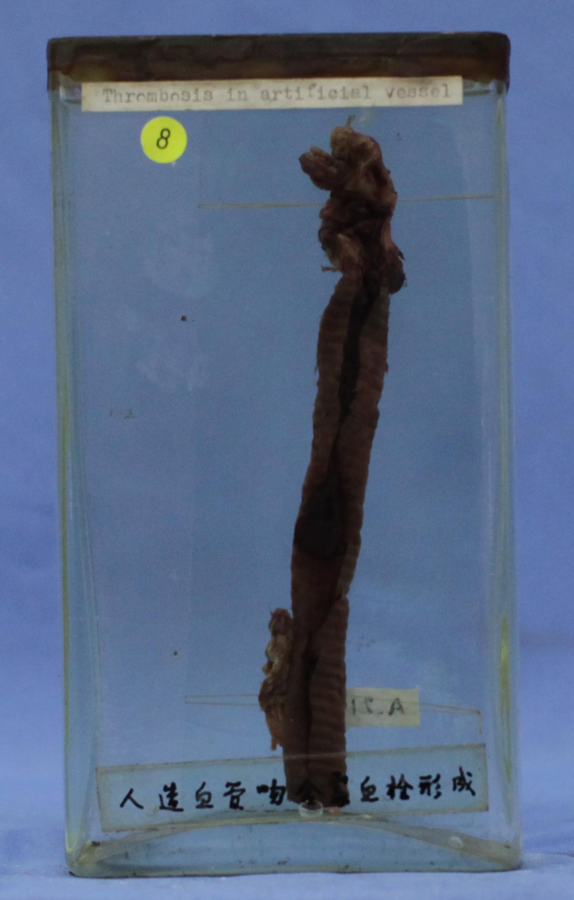 患者男性,49岁,髂动脉瘤手术后。 一段人造血管, 已纵行剪开,血管腔上端可见条柱状深褐色血栓物质黏附其中。