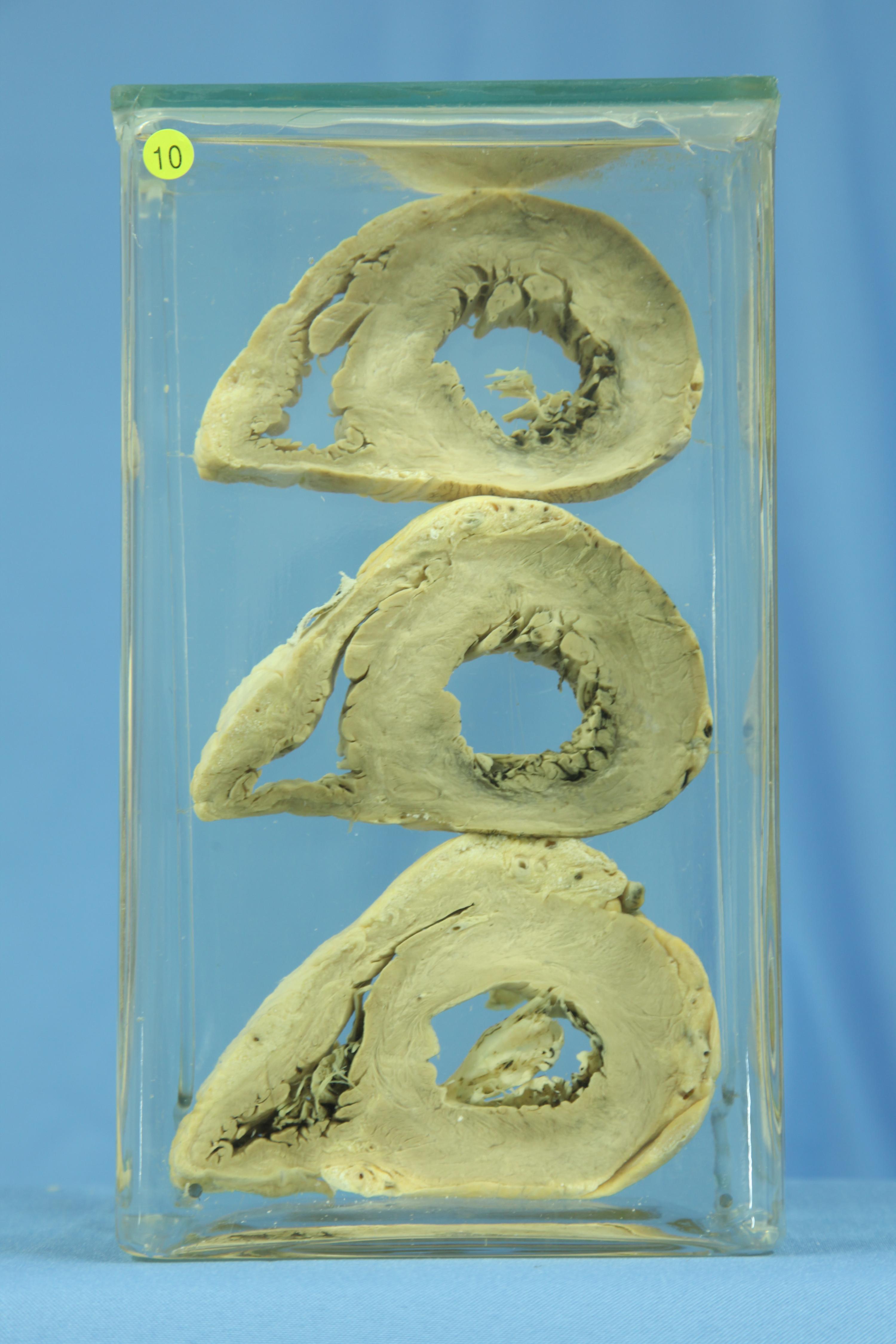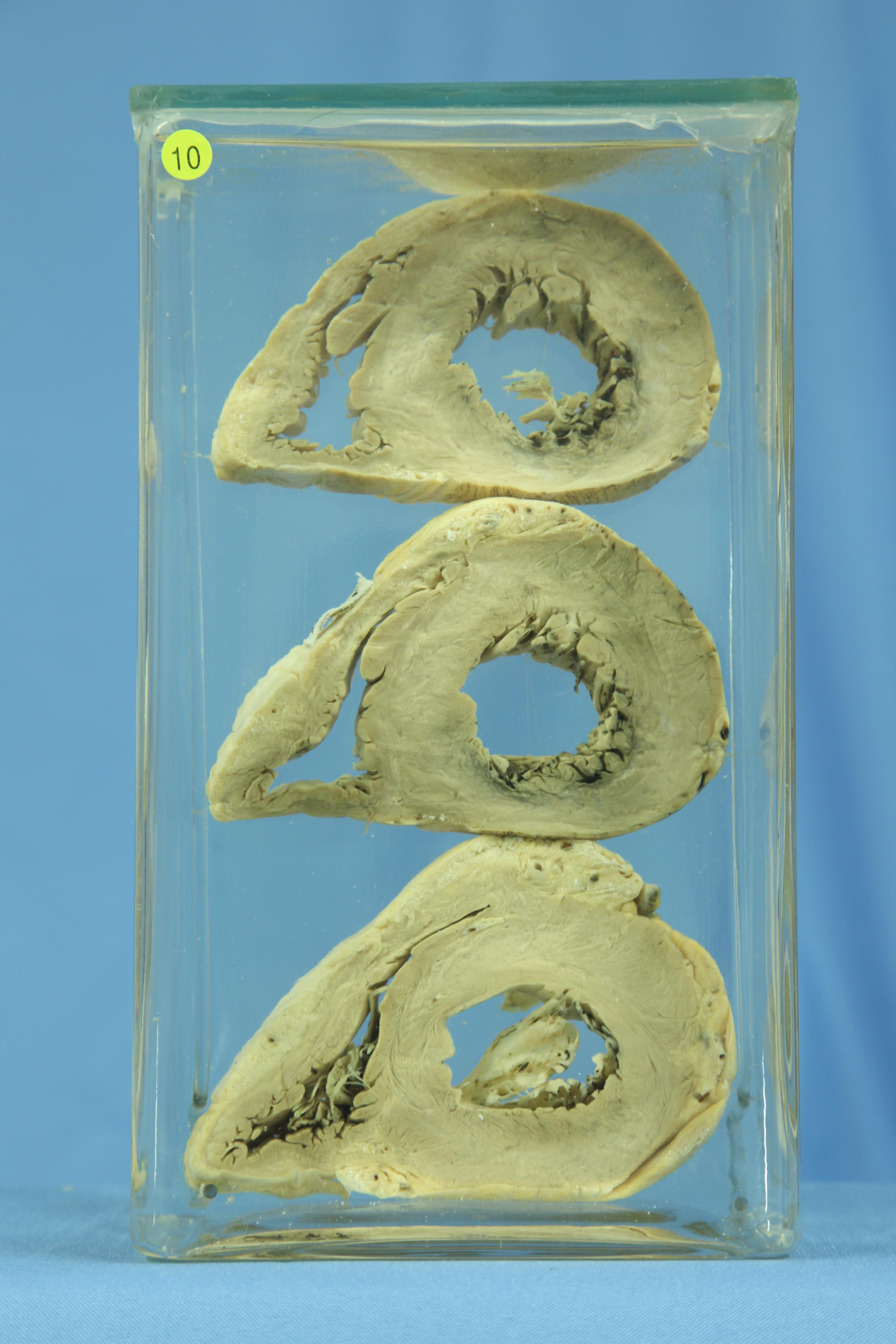 标本为三片心脏水平切片。横断面显示左心室心肌增厚,最厚处为1.8厘米, 超过正常心肌(1厘米),心腔无扩张,并可见横断面增粗的心室乳头肌。冠状动脉粥样硬化。 链接:高血压心脏病心肌肥厚镜下改变 (切片号1 心肌萎缩与心肌肥大) 左侧切片显示心肌结构正常,肥大的心肌纤维明显增粗,细胞核大,染色深,心肌间质减少。右侧一片较小切片为心肌萎缩,作为对照。
