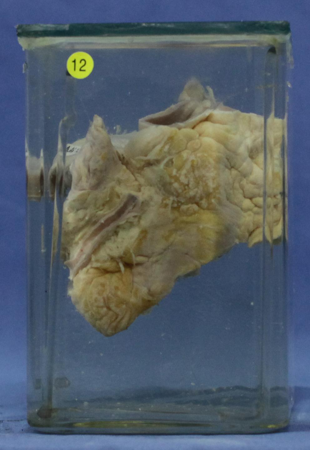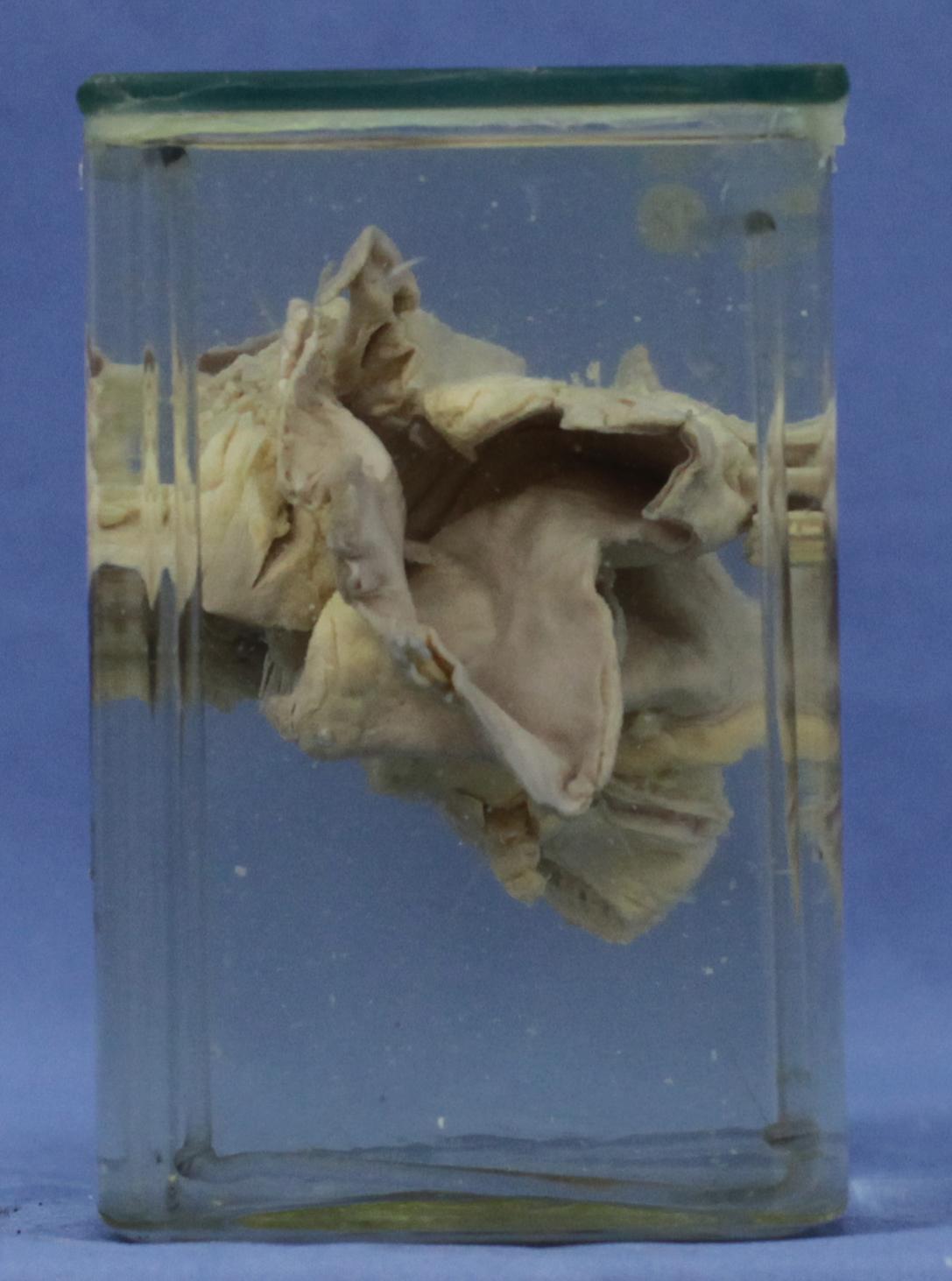 患者男性,76岁, 冠心病病史。 心脏的上半段标本, 可见在左主干和又主干的冠状动脉有多处被剪开, 暴露的管腔内可见有细小隆起的不规则斑块, 黄白色. 管腔变狭窄.